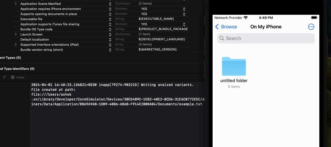 Hi, so following other tutorials on sharing app files to user I added and enabled LSSupportsOpeningDocumentsInPlace and UIFileSharingEnabled in info.plist. On app launch I create a sample file in the Documents Directory so that it shows up on the "On my iPhone" storage. I check this with the simulators for iOS17, iOS16 and it works fine, but for iOS15 it does not display the folder for my app. Does anyone have an idea on how to fix this?