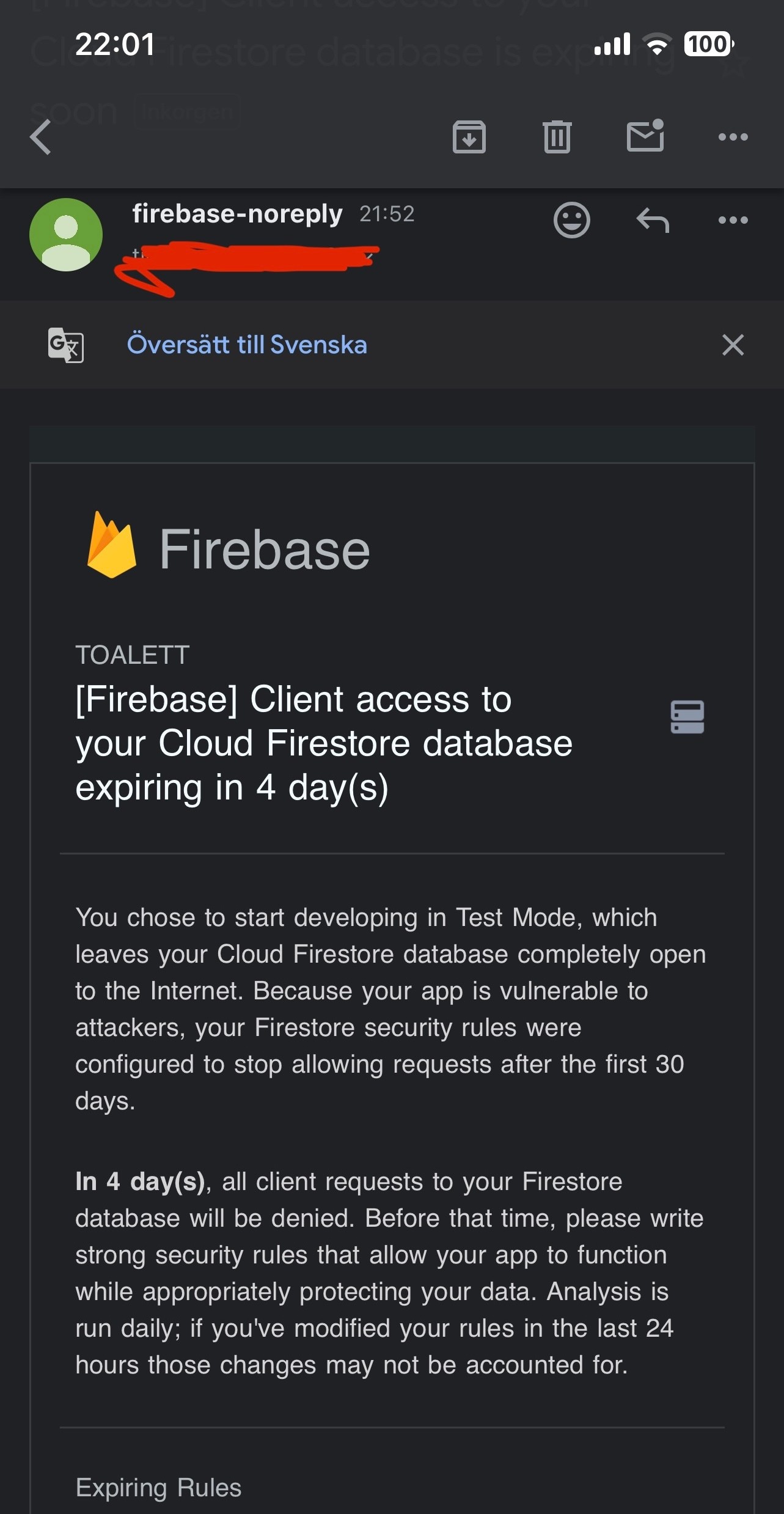 I have an iPhone app that was created in Xcode that downloads some data from Google Firebase (Firestore). Today I got a scary email from Google Firebase (as seen on the screenshot below). I'm not an expert on Google Firebase and honestly don't understand what this means.