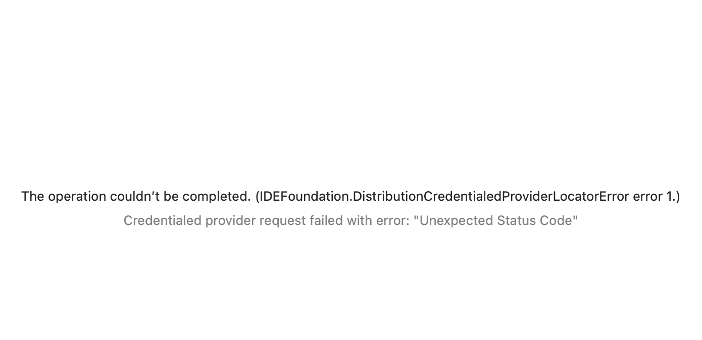 The operation couldn’t be completed. (IDEFoundation.DistributionCredentialedProviderLocatorError error 1.) Credentialed provider request failed with error: "Unexpected Status Code"