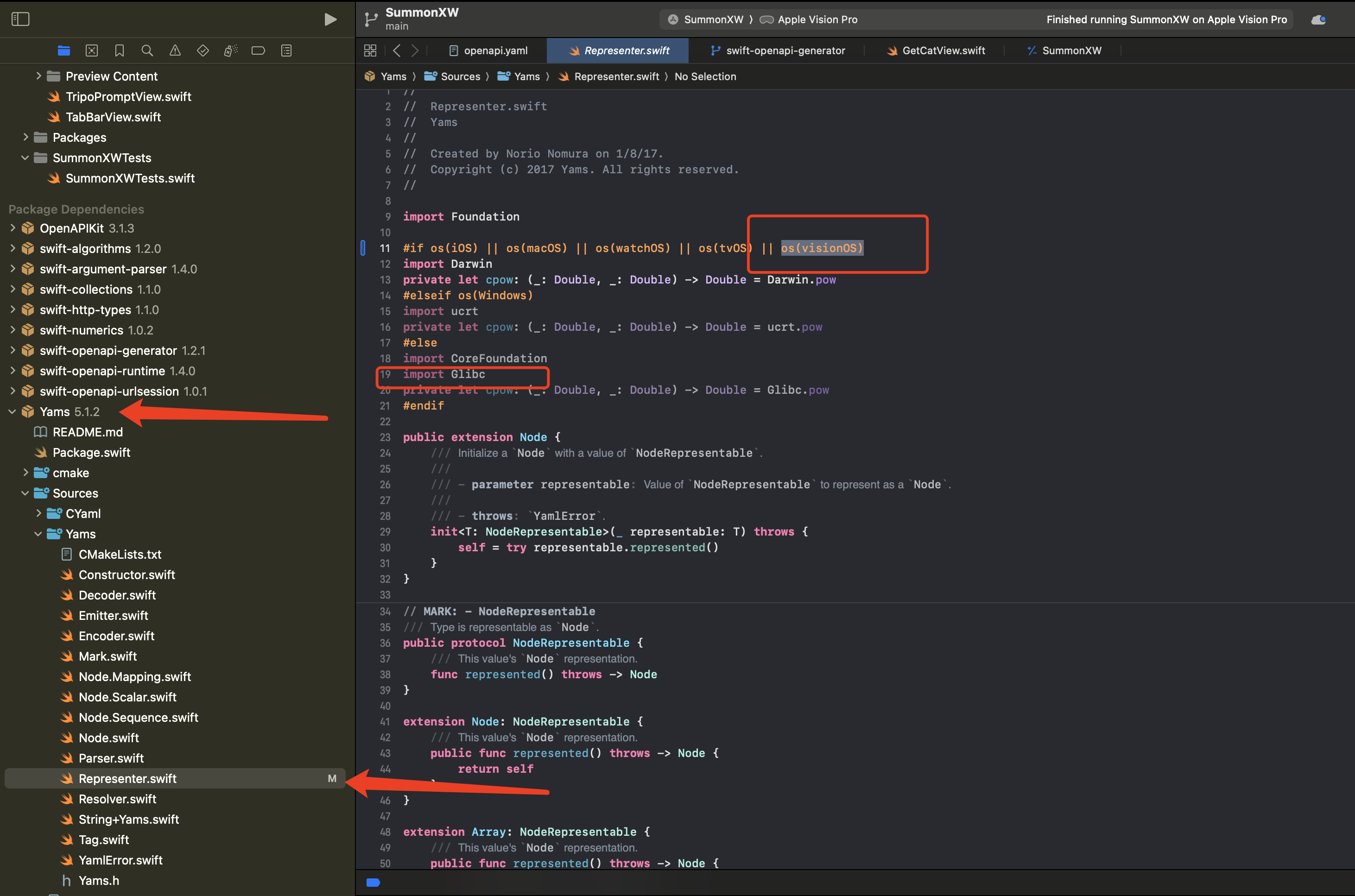 The issue has been resolved, as shown in the figure. The root cause was the inclusion of the 'swift-openapi-generator' package, which also adds the 'Yams' library. However, the 'Yams' library does not support visionOS, so I made direct changes to the source code. I have already submitted a merge request on GitHub, but it has not been merged yet.