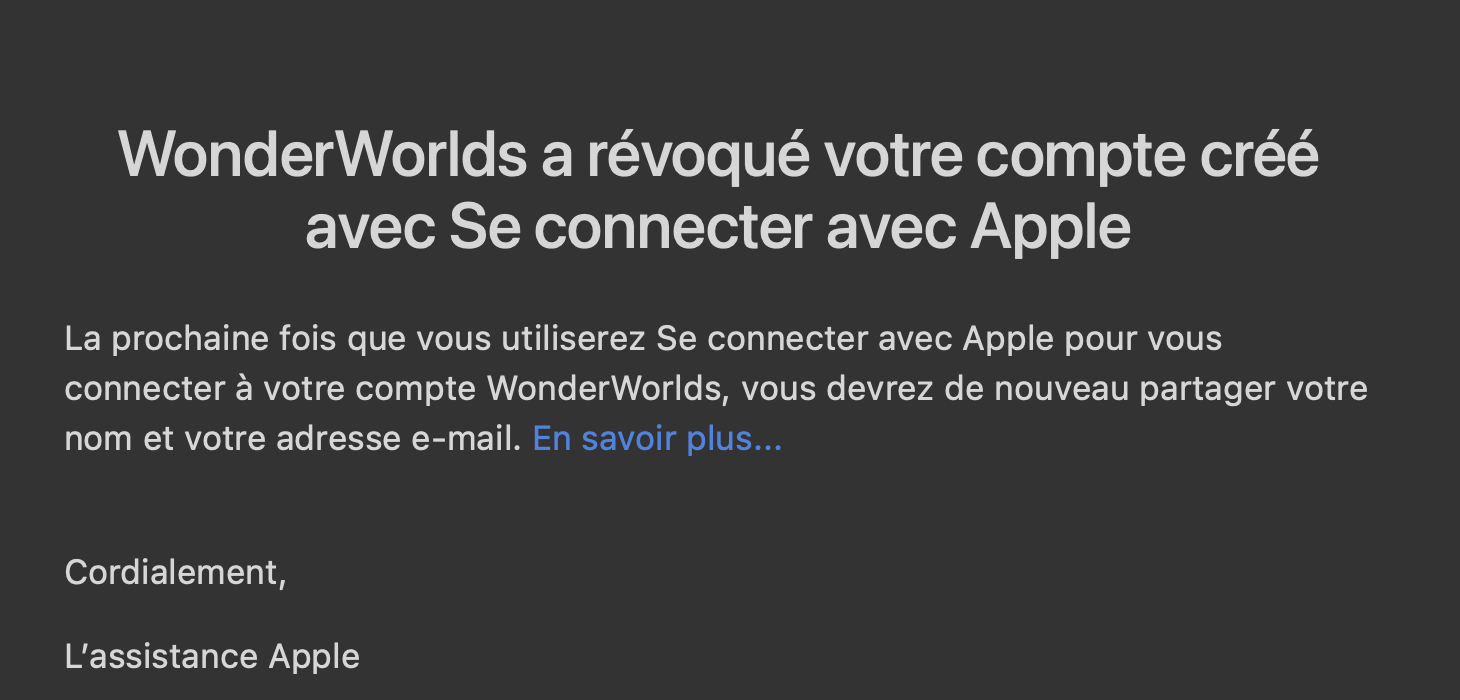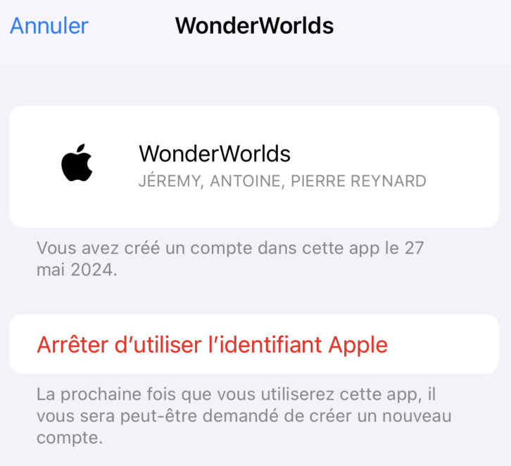 And the application no longer appears in the list of applications in the Connection and Security > Connection with Apple from iPhone section. However, when I click on the “Sign in with Apple” button again, I don’t see the window that asks me if I want to share my connection information.