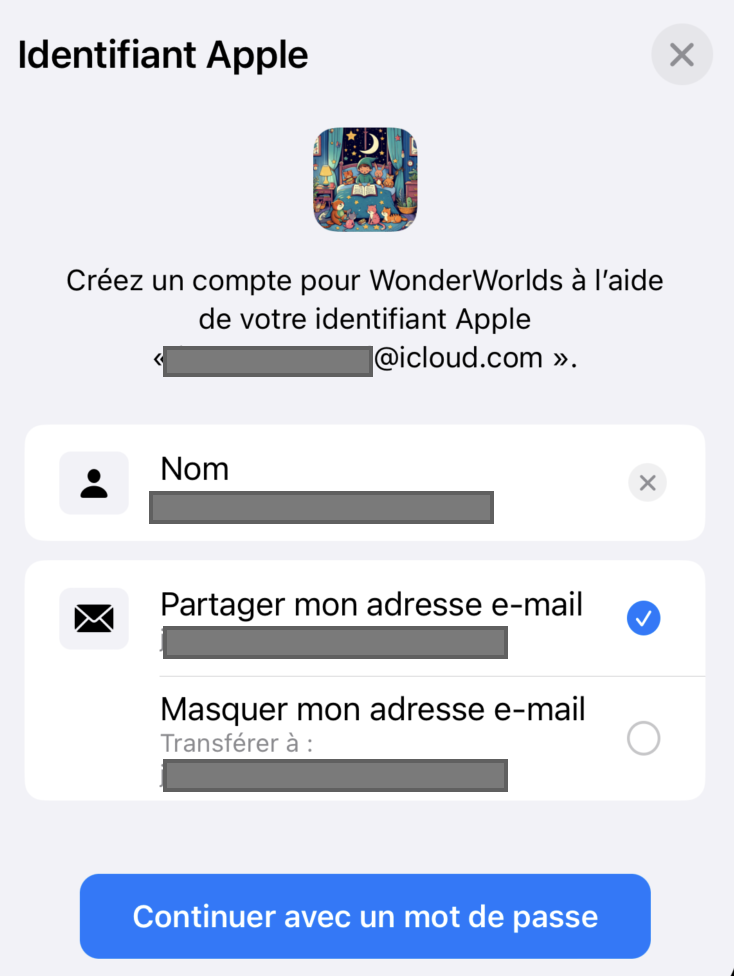 This part works without problem, when the user clicks on the “Sign in with Apple” button a popup appears asking if they agree to share this information (first and last name / email address) for account creation.