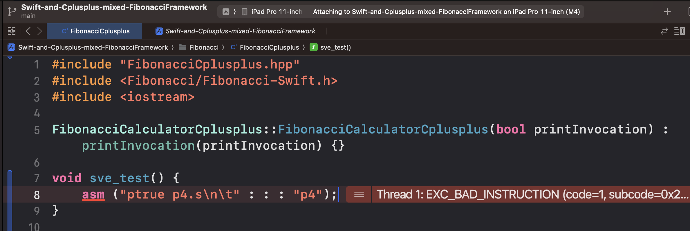 It's said Apple M4 is an ARMv9 chip. I wrote assembly with ARM SVE instructions. And set an iPad M4 simulated device as running target. When execute, it throw "EXC_BAD_INSTRUCTION" error. Does Apple M4 support SVE?