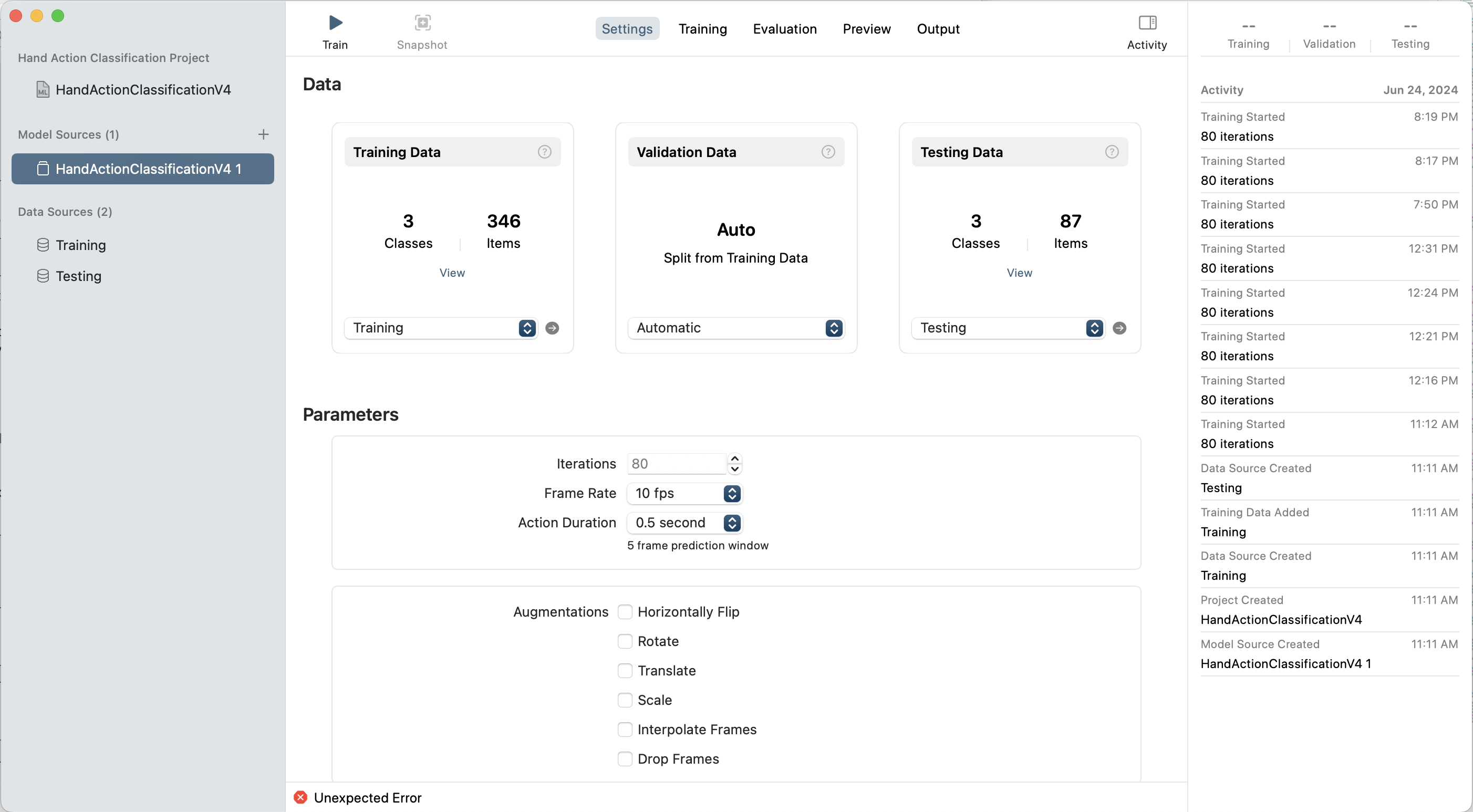 I have created a Hand Action Classification project following the guidelines which causes the Create ML tool to provide the very cryptic "Unexpected Error". The feature extraction phase is fine, with the error occurring during model training after the tool reports completion of the first five training iterations as it moves on to report the next ten.