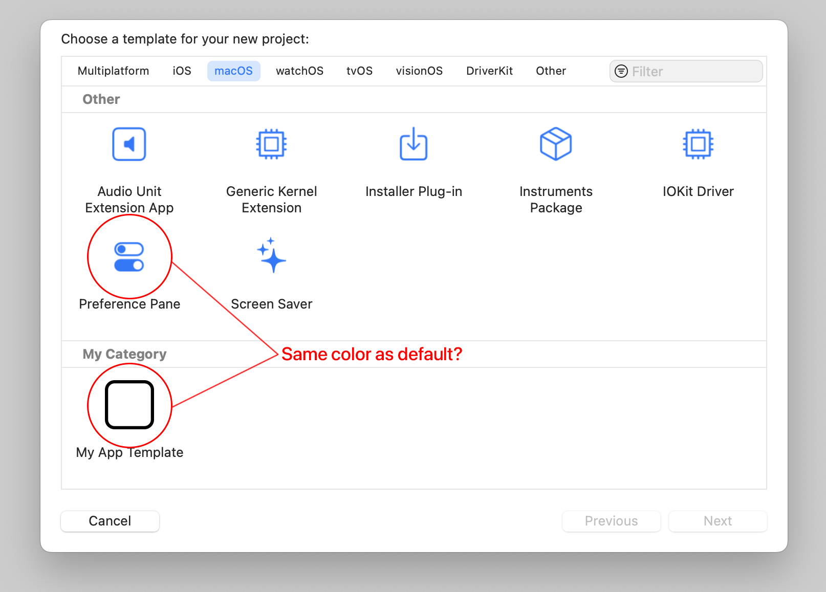 I want to create a Project Template with an icon that matches the default Xcode templates. I created a vector example icon and saved it as TemplateIcon.svg and it gets displayed for my .xcodetemplate. I would like it to blend in with Apple's default icons (which I know are assets contained inside Xcode bundles).