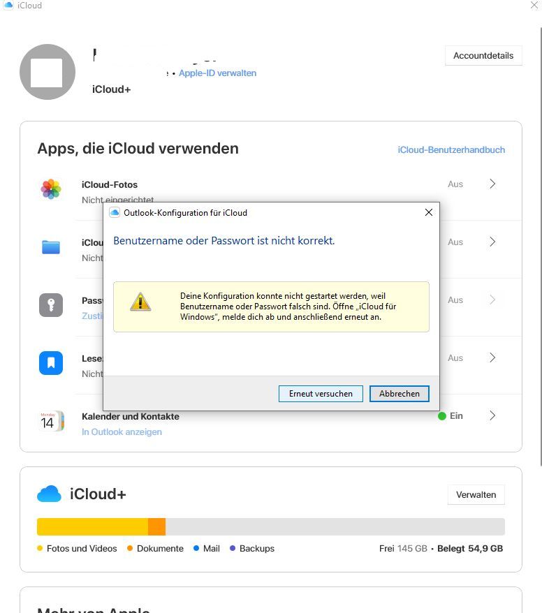 "Your configuration could not be started because A Username or password are incorrect. Open 'iCloud for Windows', log out and then log in again."