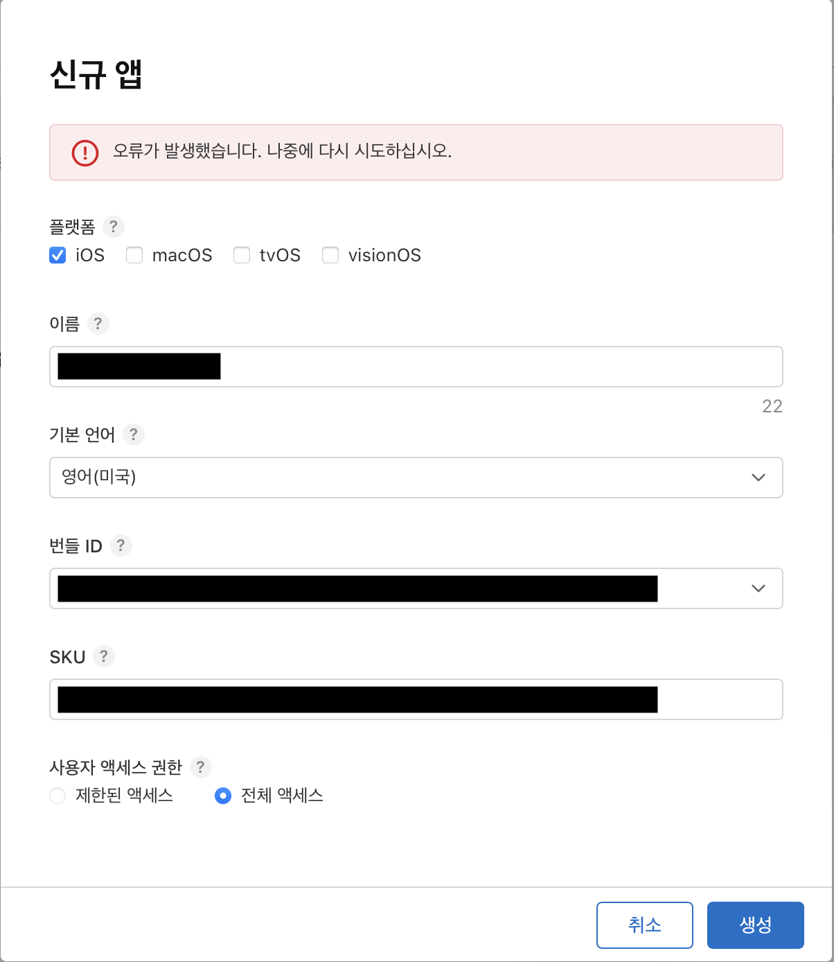 I'm encountering an issue while attempting to add a new app in App Store Connect. Despite using an unused app name and selecting the correct bundle ID, I'm unable to proceed. The process fails with a generic error message that provides no specific details about the problem.