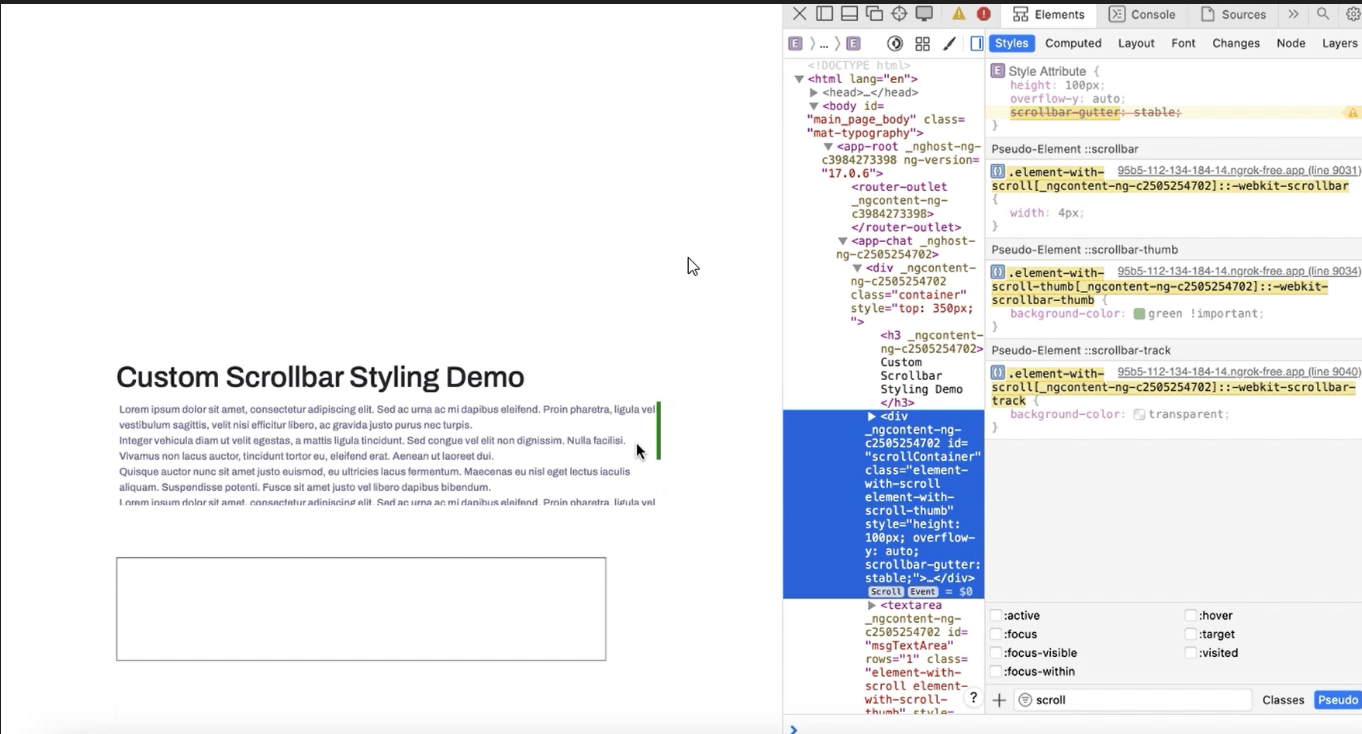 I am currently working on a web application where I need a container/textarea with overflow on the y-axis. I've managed to achieve the desired scrollbar customization in Chrome by dynamically adding a class to the DOM when a scroll event occurs. This class modifies the "::-webkit-scrollbar" pseudo-element, allowing me to toggle between different styles as needed.