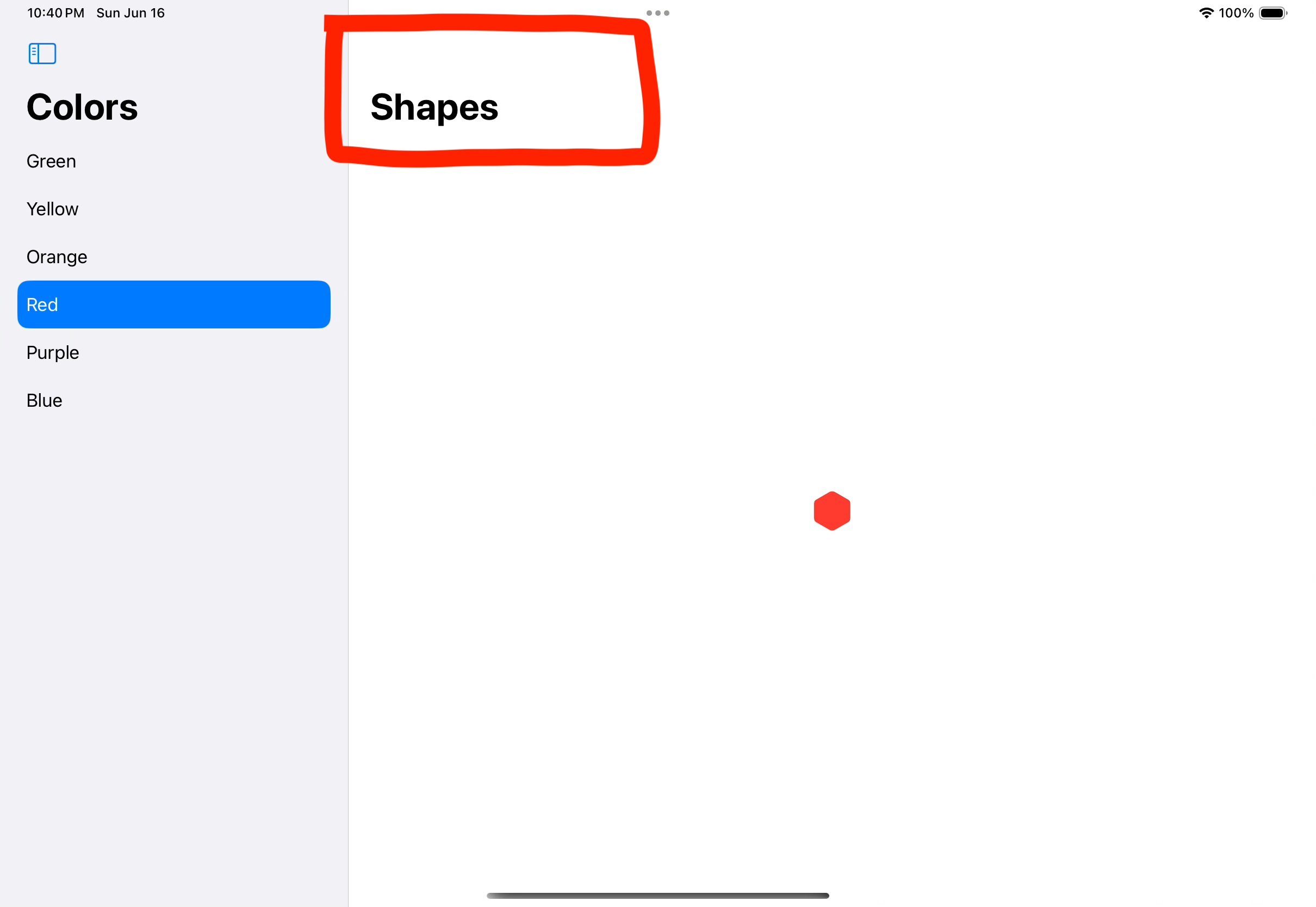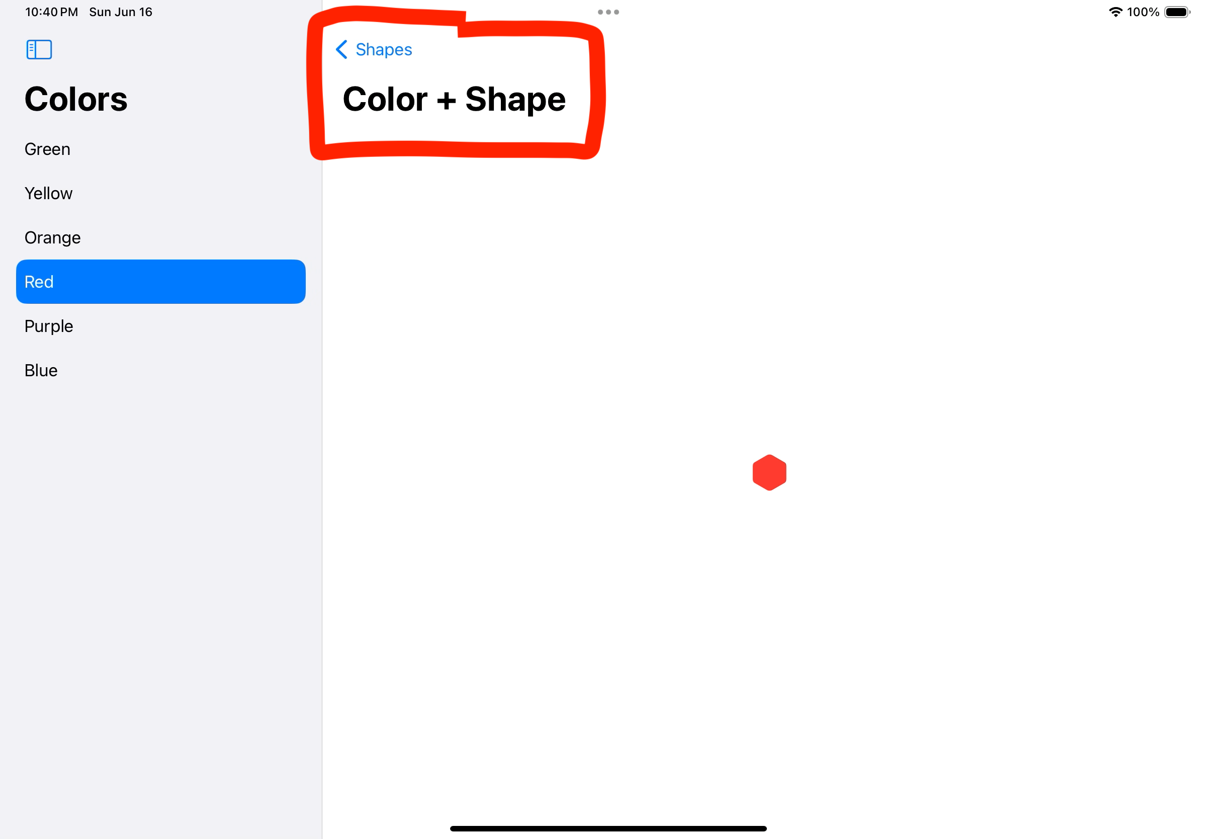 5. Make note of detail view title ("Color + Shape") and presence of "< Shapes" back button in top left of detail view.