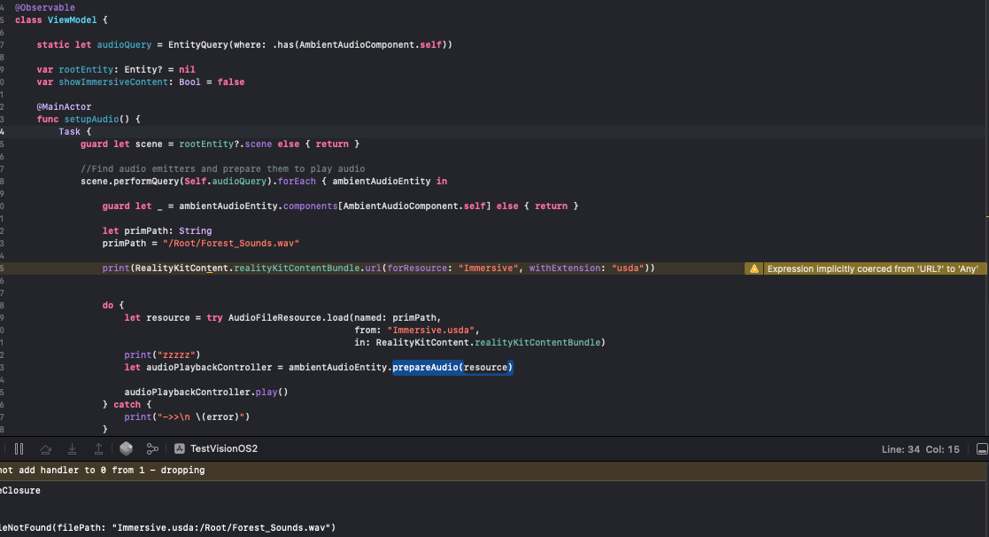 When I use the create a resources function to read the audio file in the immersive.usda file, it doesn’t work. The compiler reports that it cannot find the file in the project. I tried to get the URL of the immersive.usda file when creating a new default project, but I couldn’t retrieve it either. Why is that? Maybe I’m missing some configuration steps?