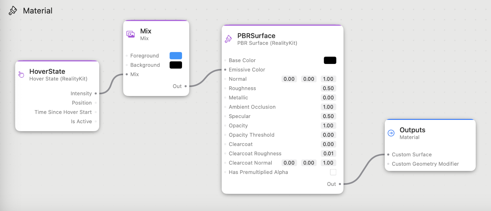 In a scenario involving one of the entities in a Reality Composer Pro environment, I intend for this entity to display a blue material when viewed by the user. To achieve this, I have added the following Shader Graphs to the materials associated with this entity: