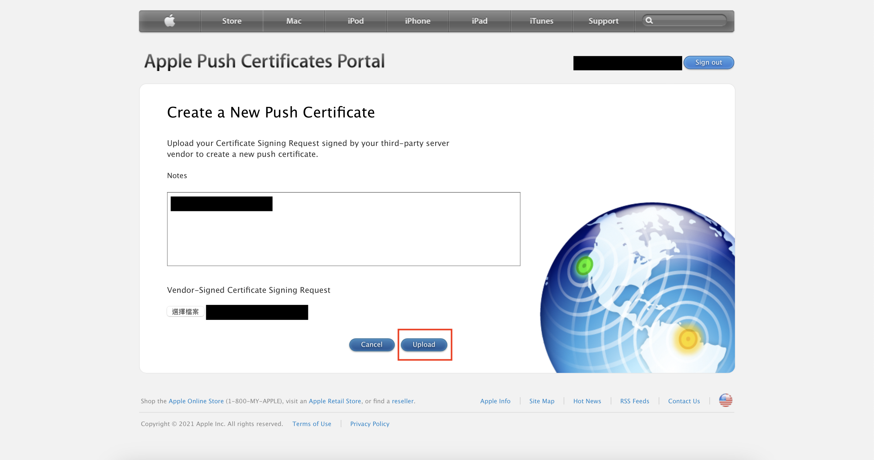 After uploading the PushCertificateRequest.plist file in the "Create a New Push Certificate" form on the Apple Push Certificates Portal, I receive a "The page you’re looking for can’t be found." response.
