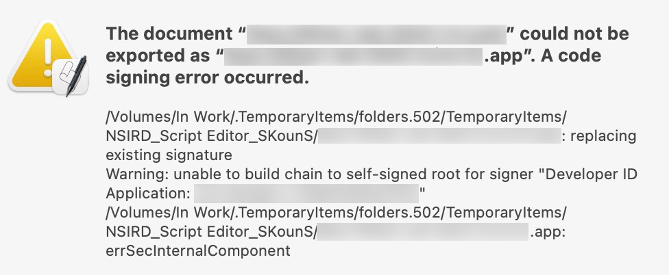 I am trying to export my AppleScript as an application and have enabled my developer ID to sign it. I, however, get an error the following error: