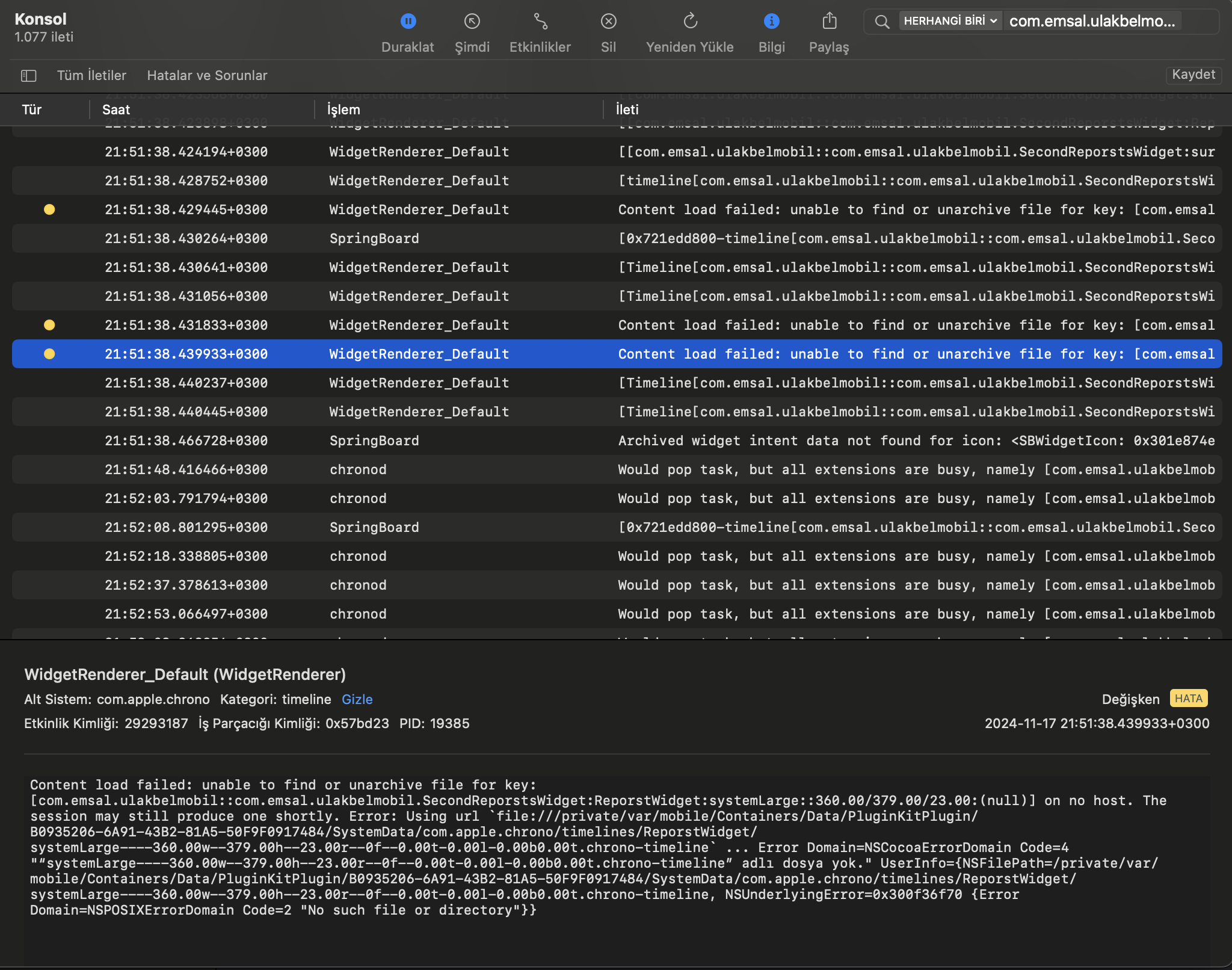 I have similar issue. Firstly when I build app my widgets doesn't list in widget. and I build extension and it adds widget to screen but it only black. I checked Console.app get these errors. one is shown in image