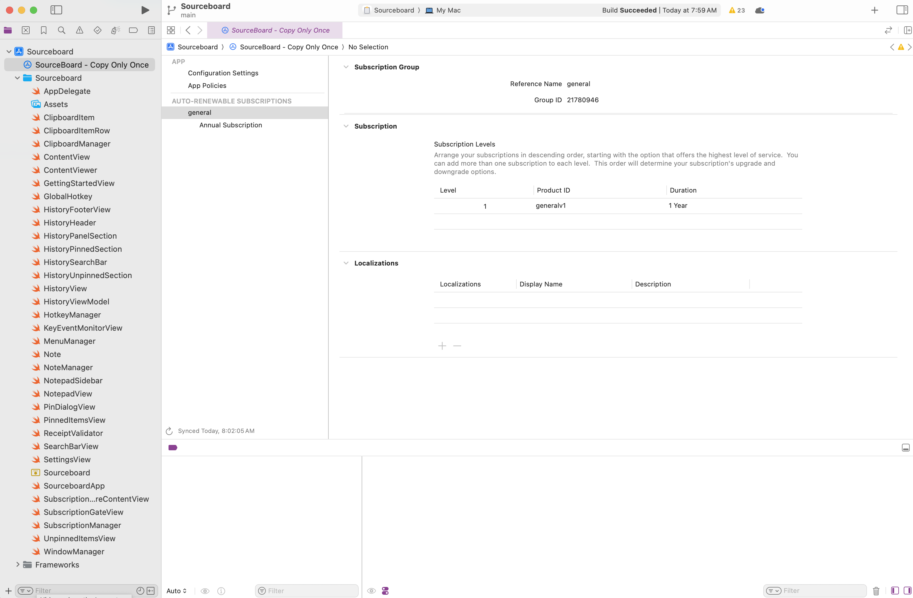 When adding the Storekit configuration file, I go through the automatic linking process and select the proper bundleID. The configuration file says 'Synced @ [CurrentTime]' however there are no subscriptions listed in there.