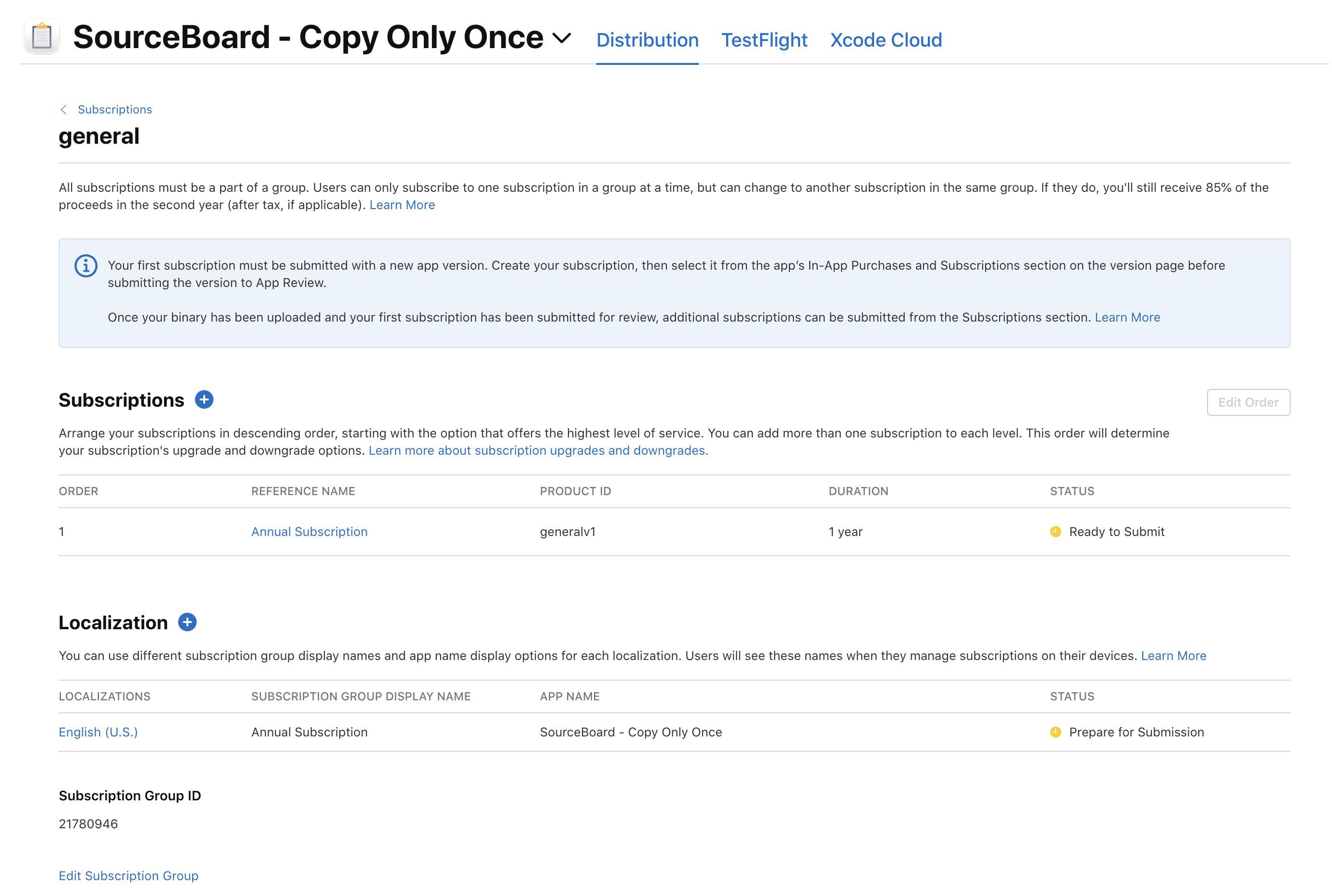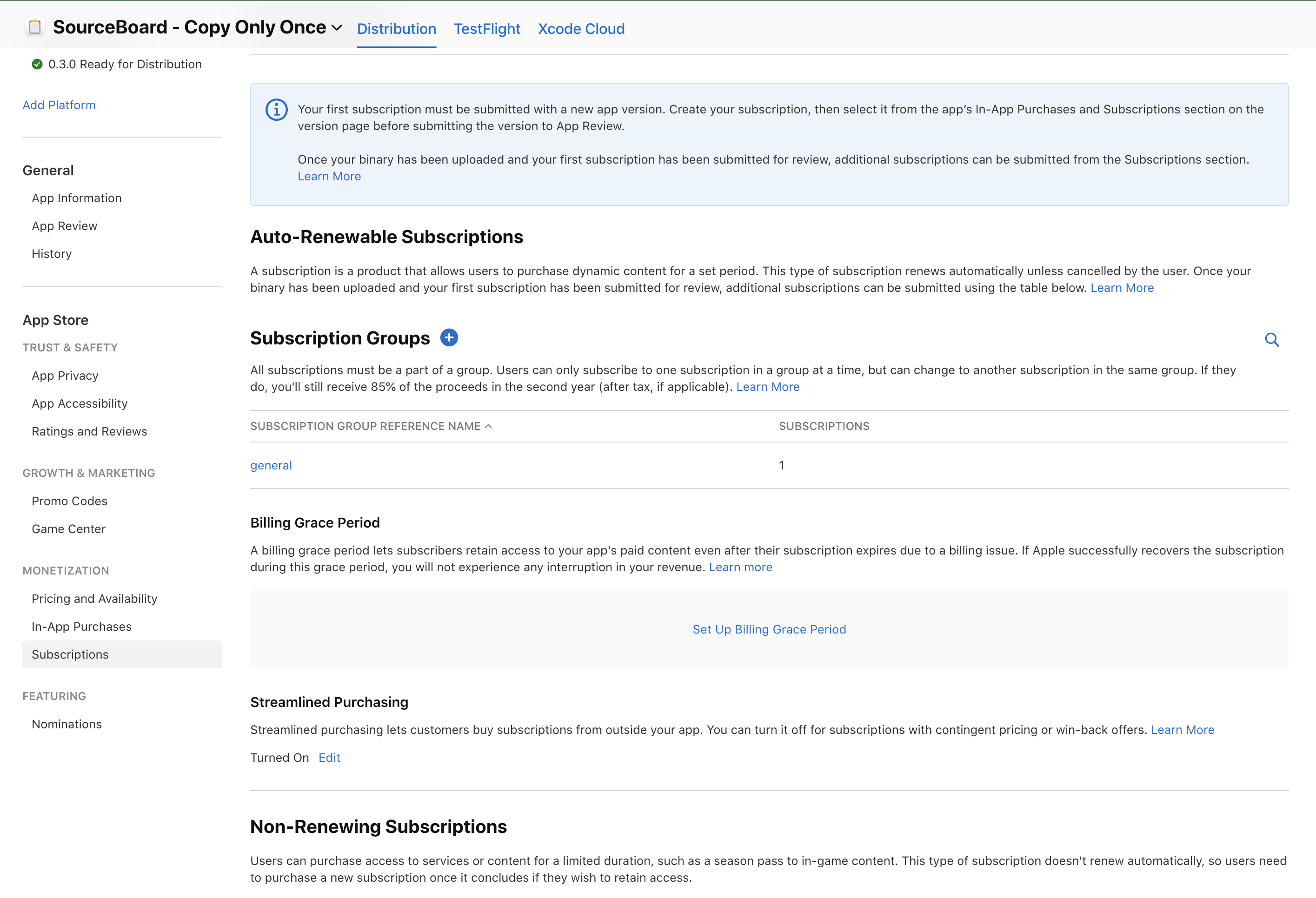 I am attempting to add Subscriptions to an App that Is already published on the App Store.