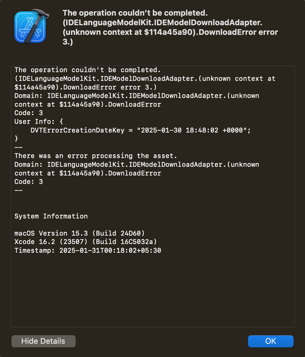 System Details: Xcode Version: [Xcode 16.2 (23507) (Build 16C5032a)] macOS Version: [macOS Version 15.3 (Build 24D60)]