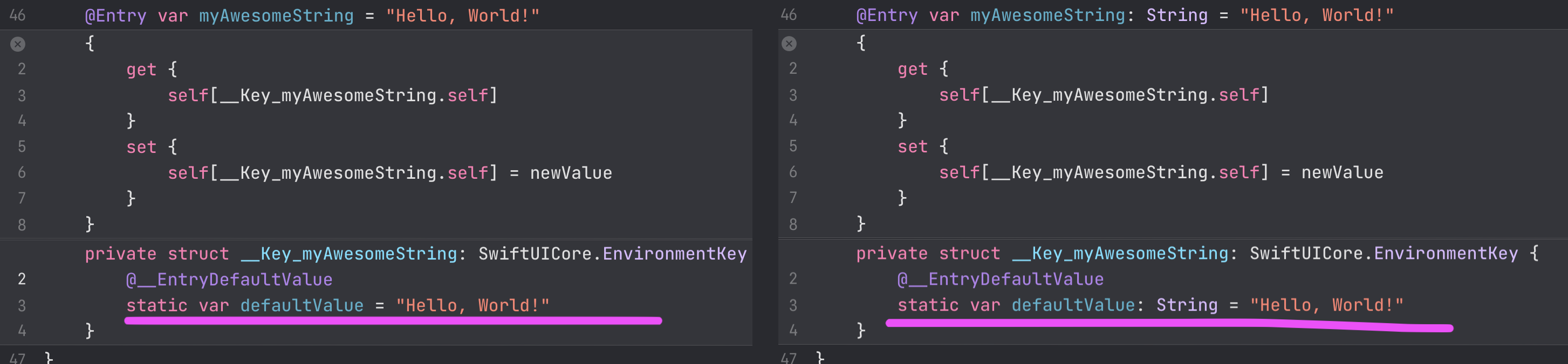 In Xcode 16.2, @__EntryDefaultValue has been added to the generated code, which Xcode does not want to expand. Visually, it seems that a stored property is generated, but the behavior shows that as a result we have a computed property, and for both options: with an explicit type and without an explicit type.