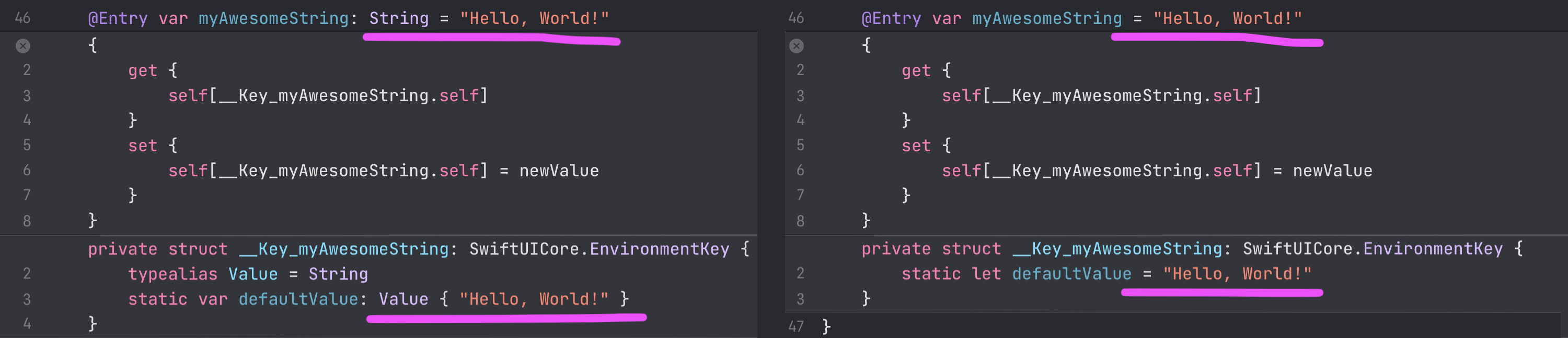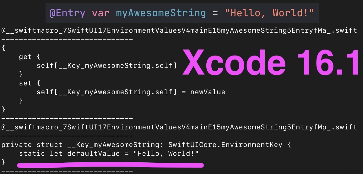 So the question is: what does this @__EntryDefaultValue macro generate and is the result a bug? Or was it a bug in previous versions of Xcode?