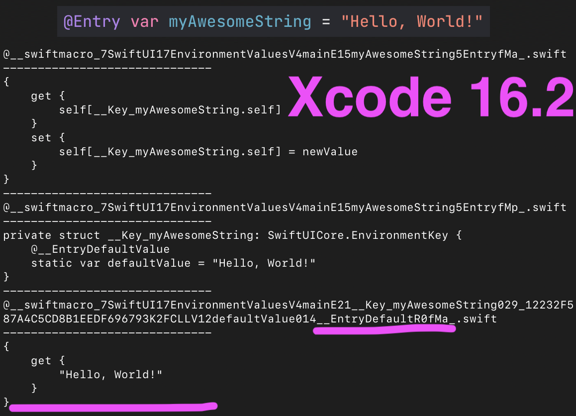 Well, if Xcode doesn't show it, there are other ways. And indeed, this @__EntryDefaultValue macro makes the variable computed. So in Xcode 16.2, the behavior of @Entry is different from Xcode 16.1.