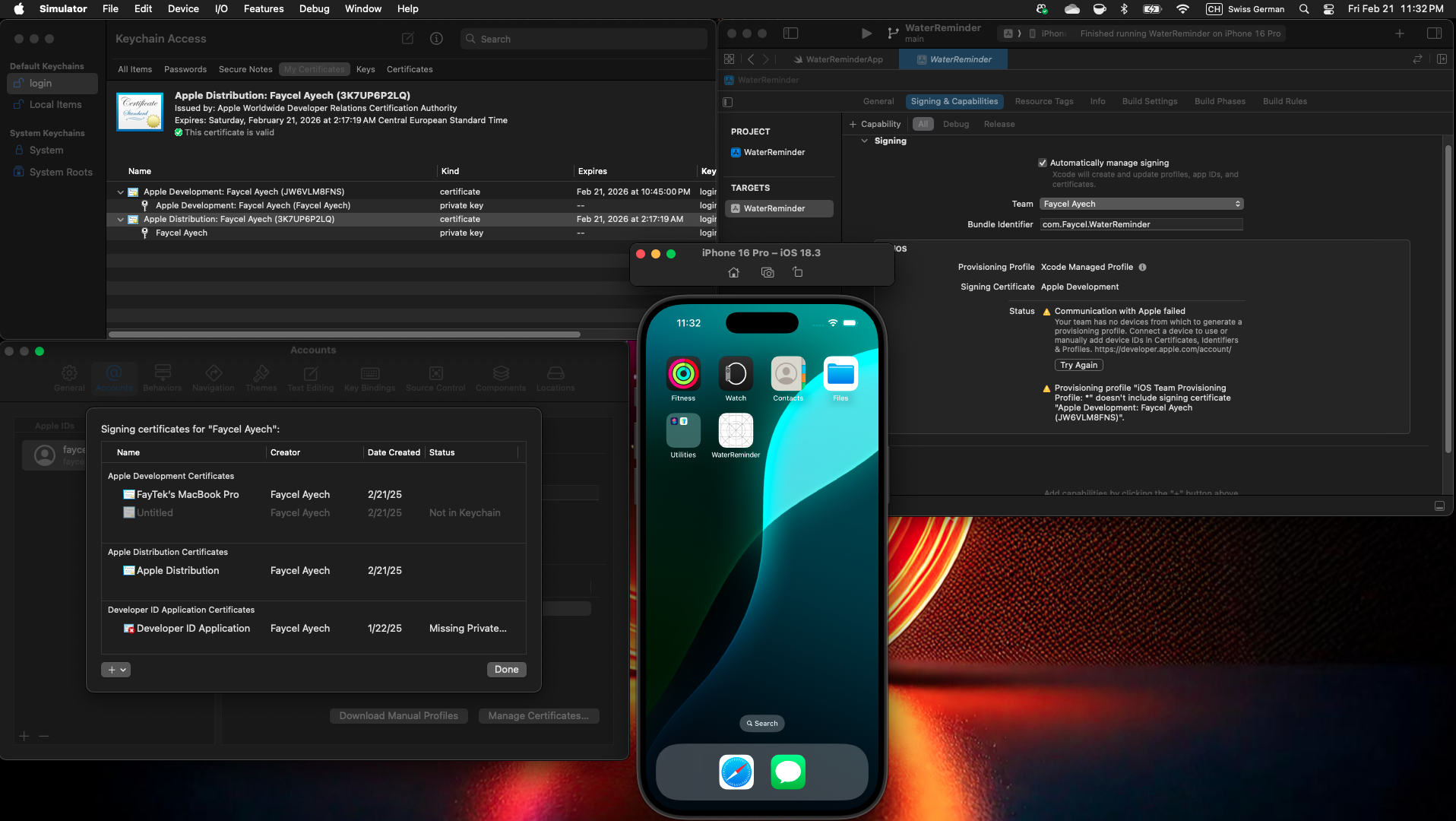 Provisioning Profile Errors: I receive the following errors in Xcode: No profiles for 'com.Faycel.DrawCraft' were found. Invalid trust settings. Restore system default trust settings for certificate "Apple Development: Faycel Ayech (JW6VLM8FNS)". Simulator Issues: Due to the above issues, I am unable to run my app on the Simulator (using an iPhone 16 Pro simulator). Steps I’ve Already Taken: