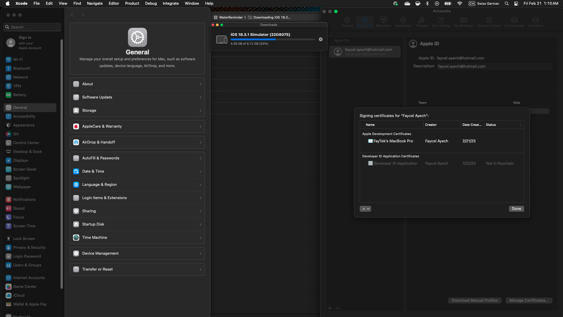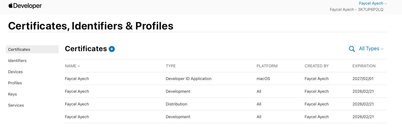Team Name Mismatch: My Apple Developer Program team is registered as Faycel Ayech (Team ID: 3K7UP6P2LQ), but in Xcode, only “Faycel Ayech” is displayed (the Team ID is missing). This seems to be affecting code signing and provisioning. Incorrect Certificate Association: The Apple Development Certificate in Xcode appears to be associated with my MacBook’s name (FayTek's MacBook Pro) rather than my personal Apple ID (Faycel Ayech). Despite revoking and recreating the certificate multiple times on both the Apple Developer Portal and within Xcode, the issue persists.