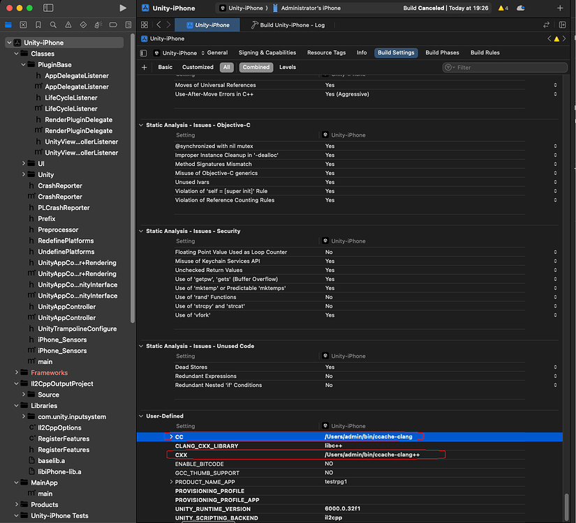 It's a simple project but the building time lasted over 10 minutes and I found a page https://discussions.unity.com/t/optimizing-ios-and-macos-build-times-using-ccache/809570