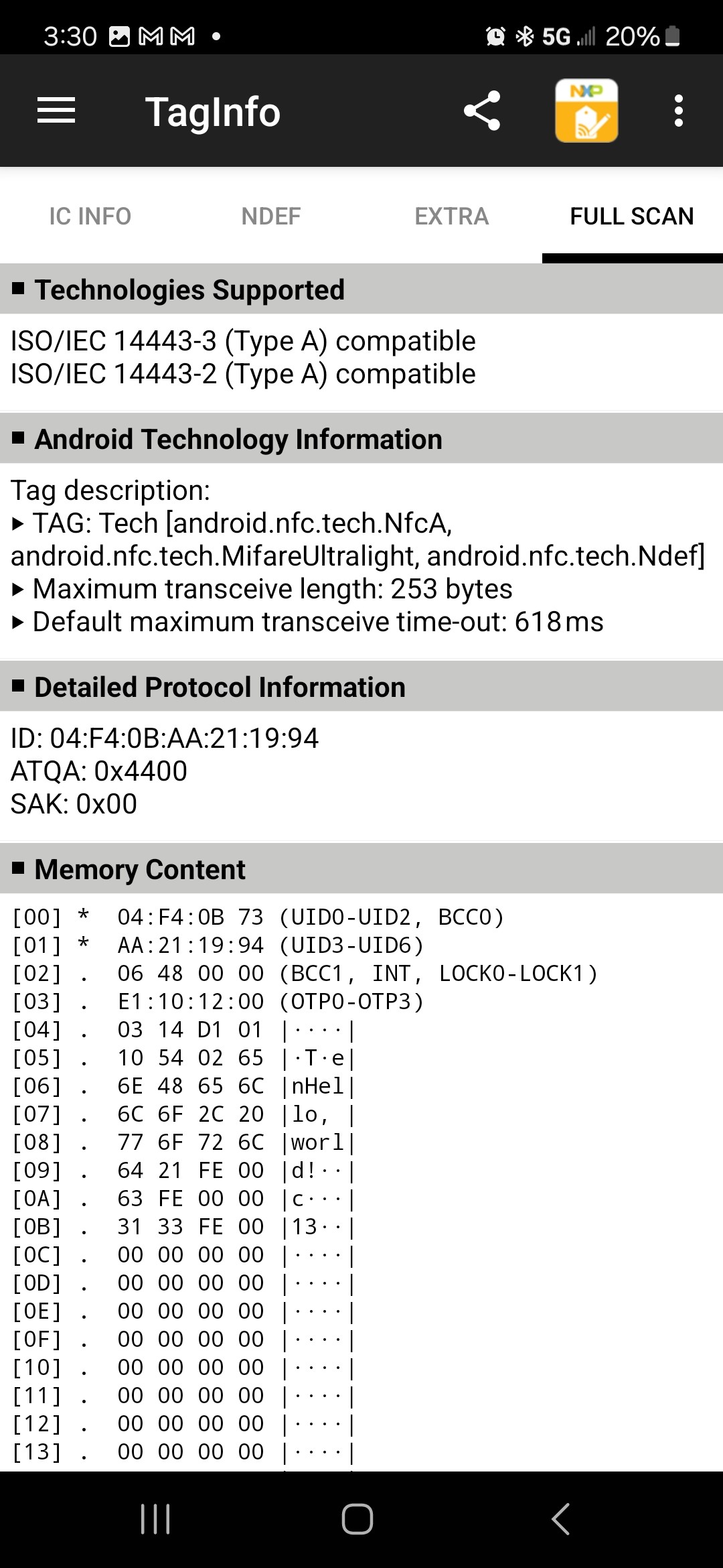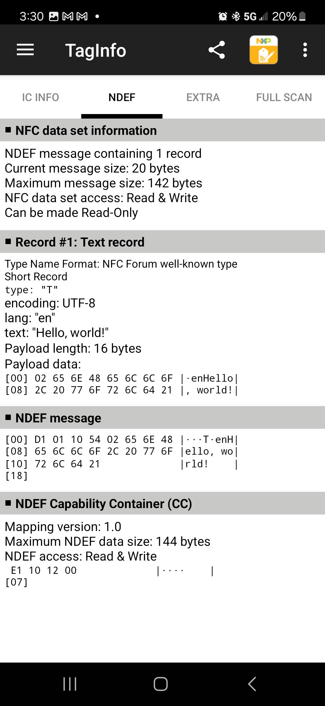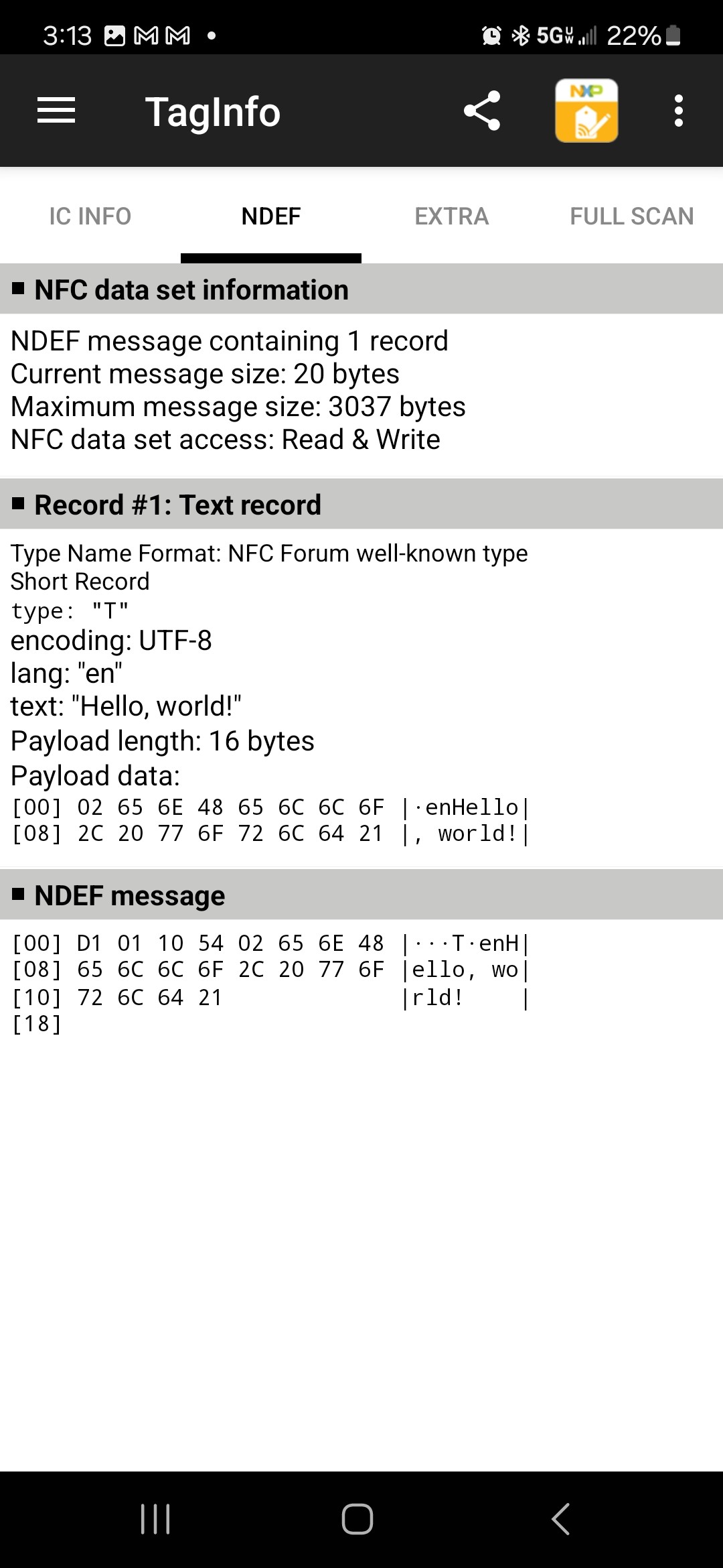 I wrote the same "Hello, world!" message into an NXP NTAG213 and read it back. The results are (5 screenshots):
