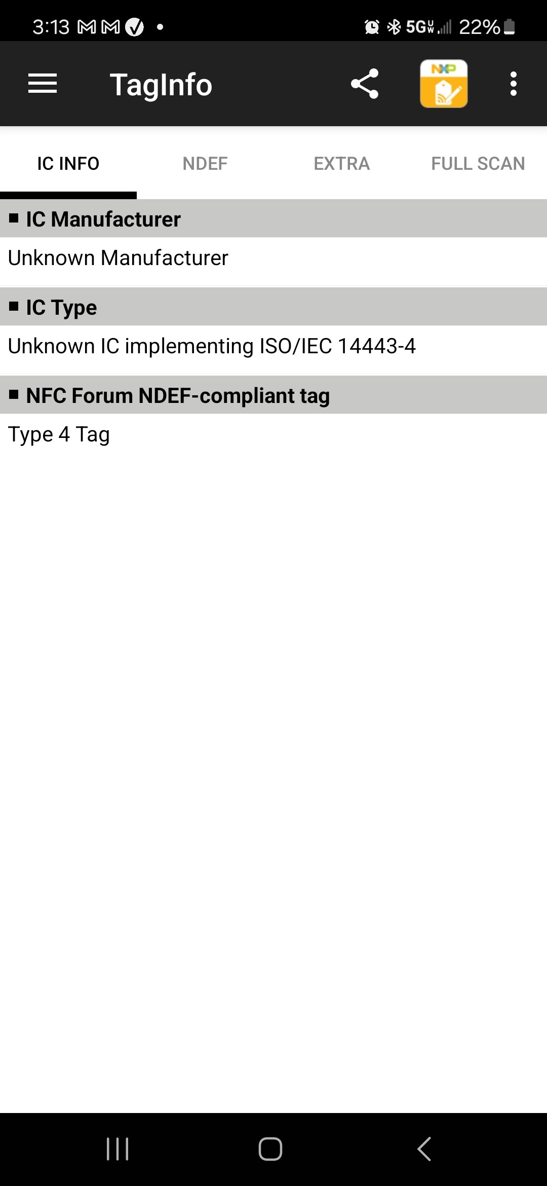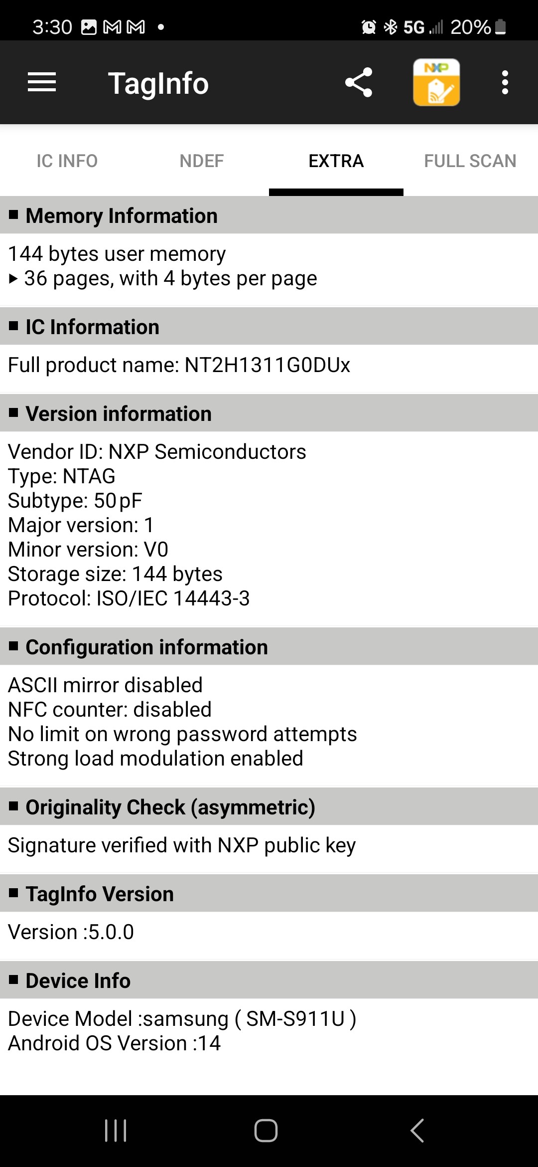 I used NXP TagInfo to gather more detail about the data written on the tag and its characteristics. TagInfo returns the following information when reading the RF430 tag with the Android system (3 screenshots):