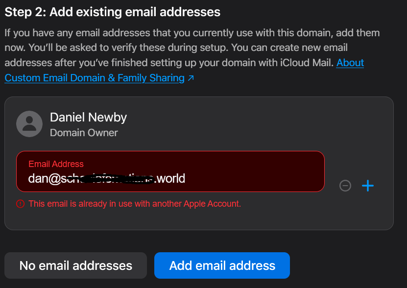 I am trying to add a custom domain to my iCloud+ Mail however when I try to add its main user/email address I get an error saying that the email is already in use with another apple account.