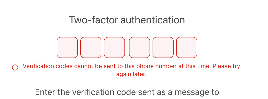 Why log in to my App Store Connect, it appears the following error: "Verification codes cannot be sent to this phone number at this time. Please try again later.". This is my daily use phone number, there is no problem with it, I can receive calls and message normally. There were no such problems before with verification for this phone number. I try: resend code with both options: Text code again and Get a phone call but no luck.