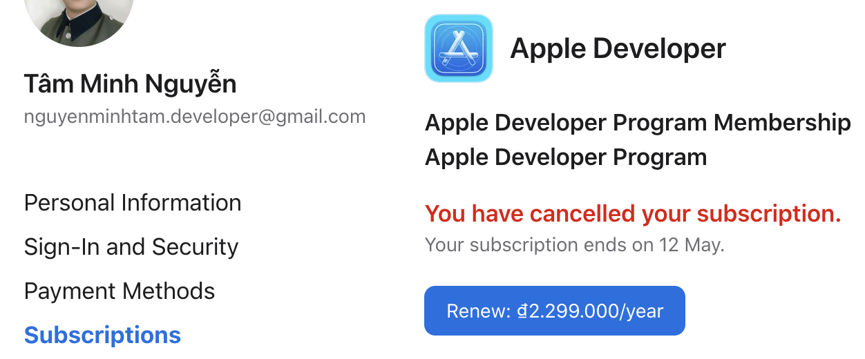 - When I checked my Apple ID subscription list on account.apple.com, I noticed that the Apple Developer Program Membership is still listed under my personal Apple ID. However, when my client logs into their Apple ID subscription list, the Apple Developer subscription does NOT appear under their account.