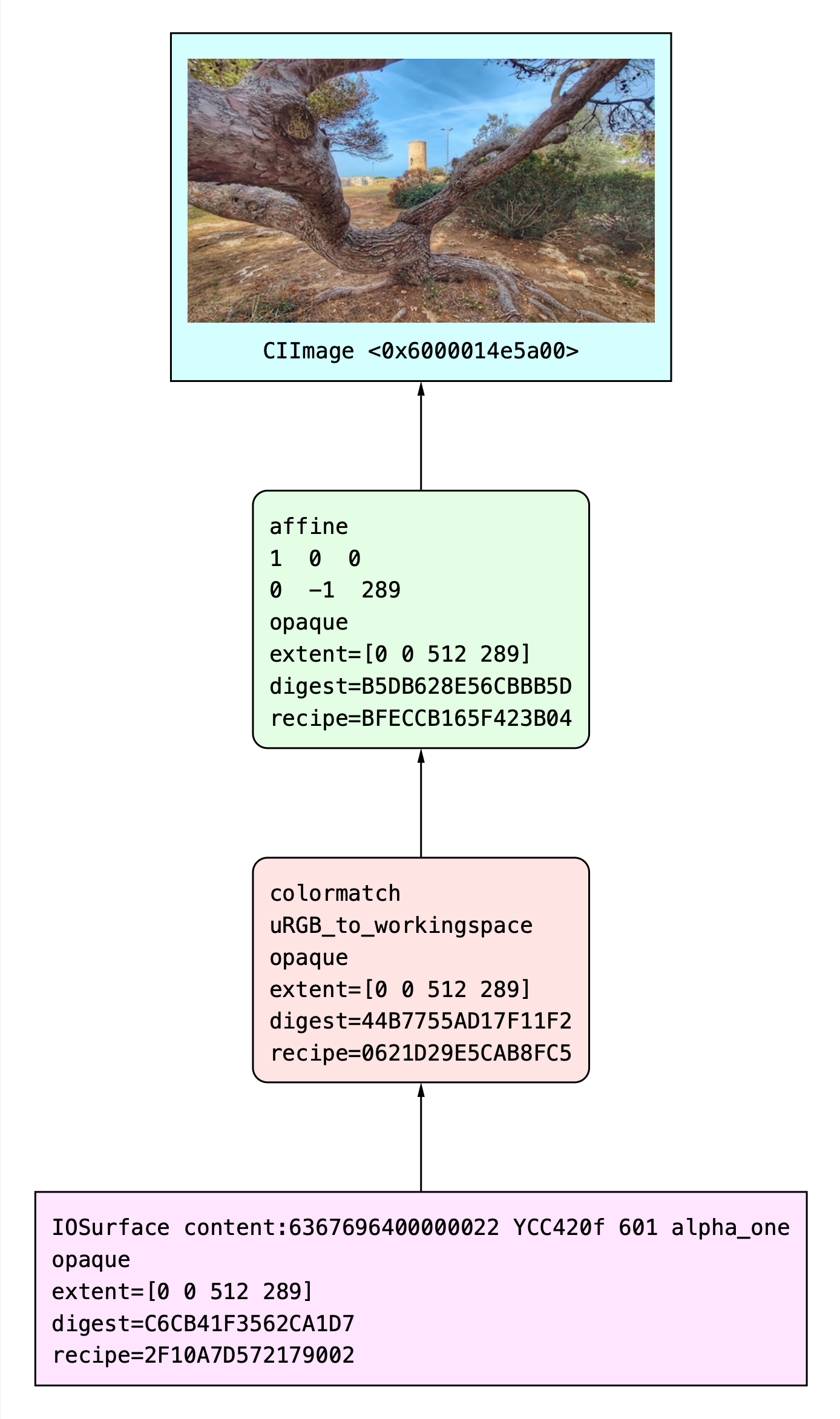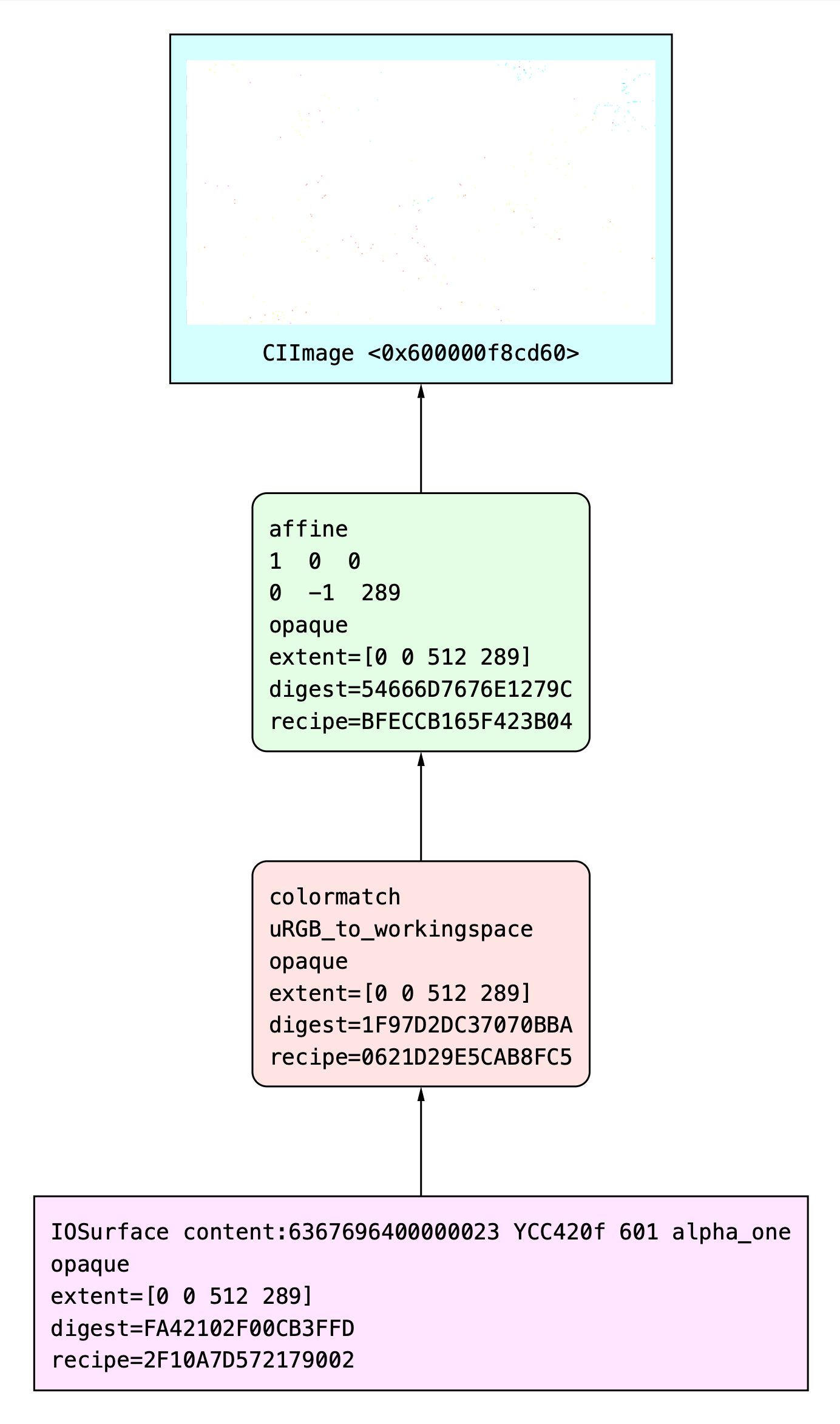 - When comparing the different Core Image render graphs between AppKit (working) and Catalyst (faulty) builds, they look identical—except for the result.