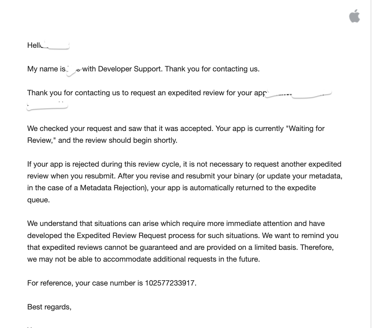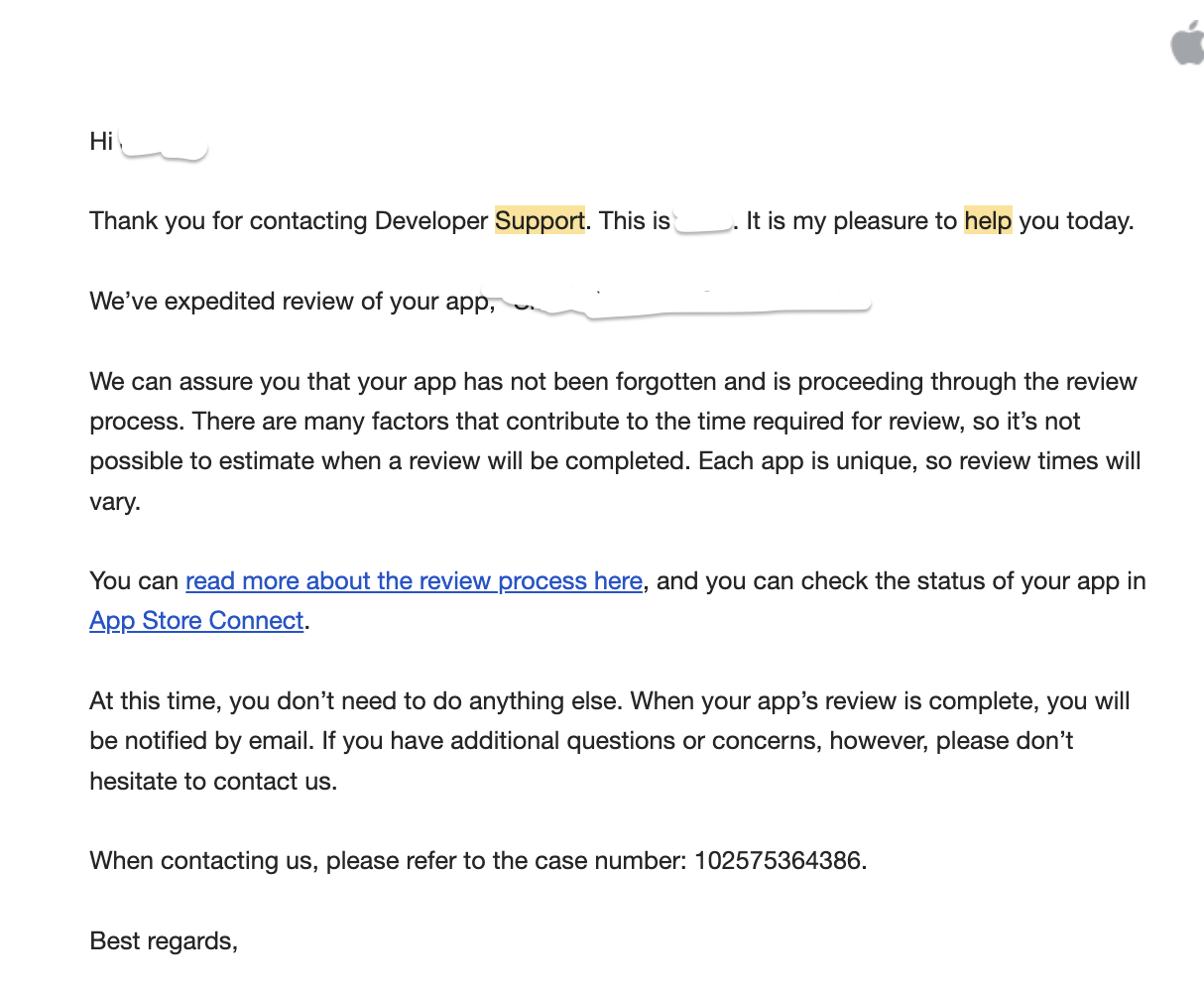 Hello, I'm writing this as I've recently been struggling with the app review process. Nearly 14 days ago, I tried to push an update for submission, as it contained an update for my app that was urgent. I have a second app that I recently developed and launched, roughly 3 days ago. However, I have not gotten any updates on the review process. I contacted support via email twice, in regards to the first app's update. The first time, I recieved a response saying Apple themselves has expedited my app. I did not request an expedited review, I simply asked why the review was taking too long. I assumed the app would be reviewed shortly after, as it was expedited, according to Apple. The second time, I emailed because there were still no updates. I recieved a similar response, saying my app is still waiting for review and the reivew should commence shortly. However, after waiting multiple hours, there are still no updates. Here is the response I got the first time.