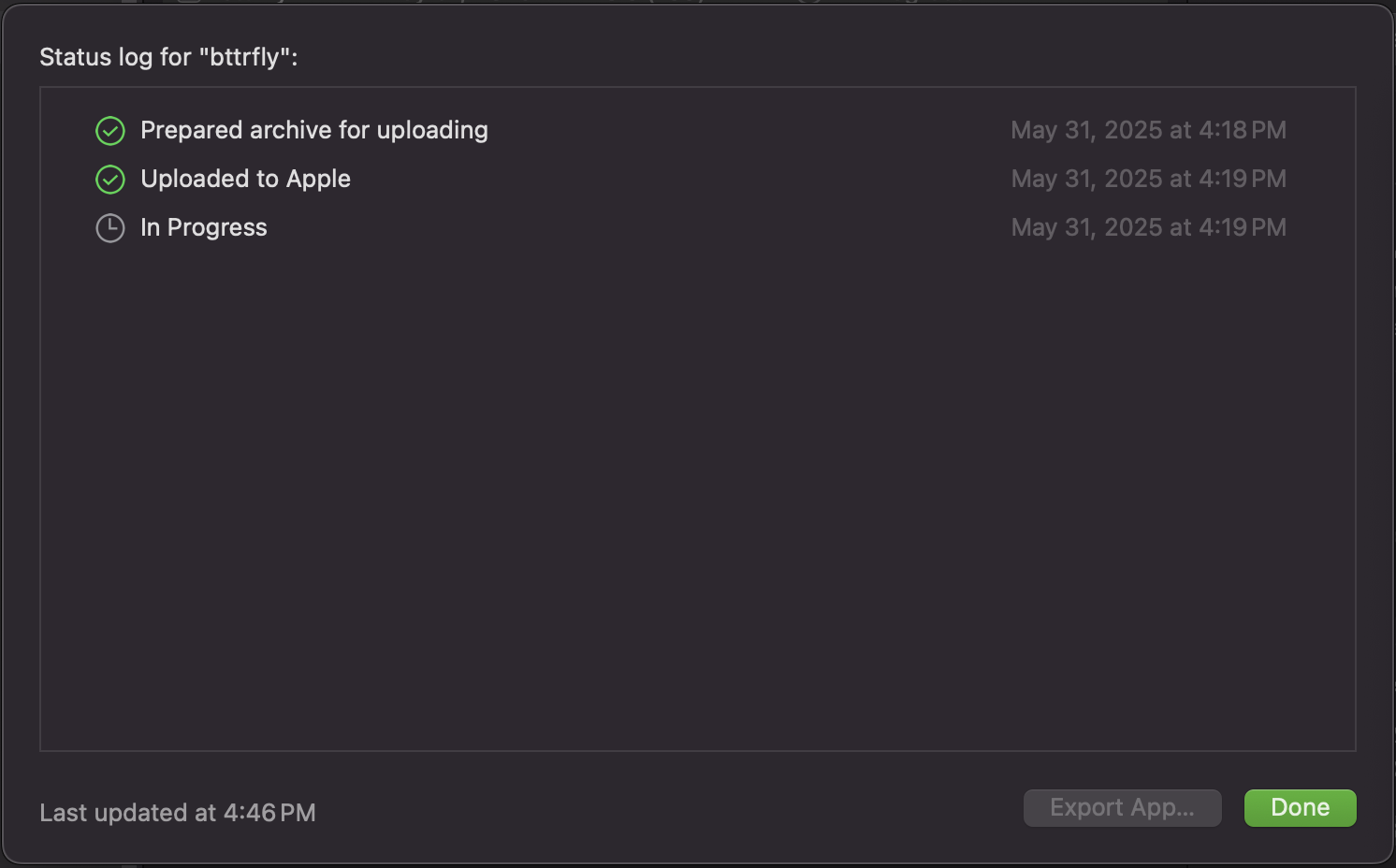 - Re-exported + re-uploaded the archive via Xcode Organizer → same result, new UUID also stalls.