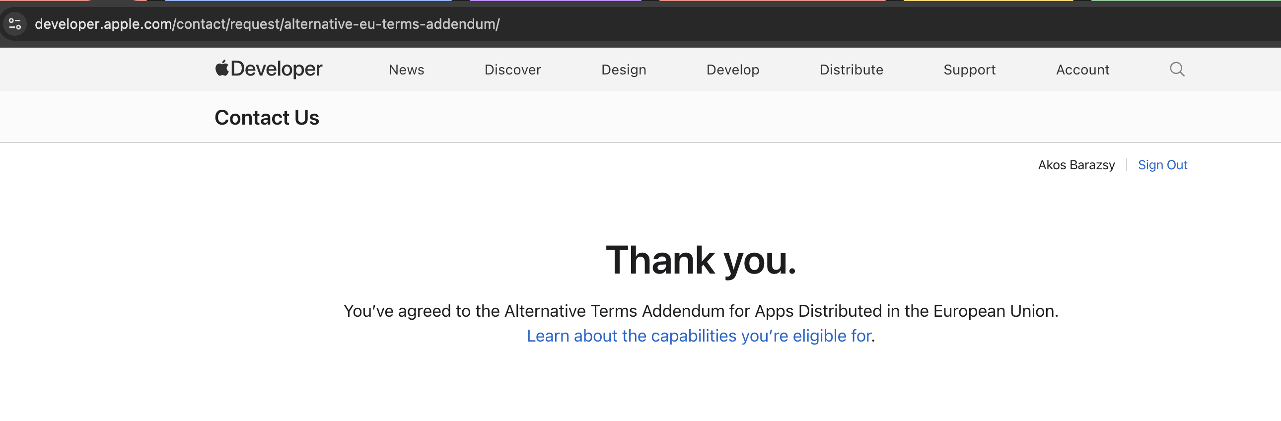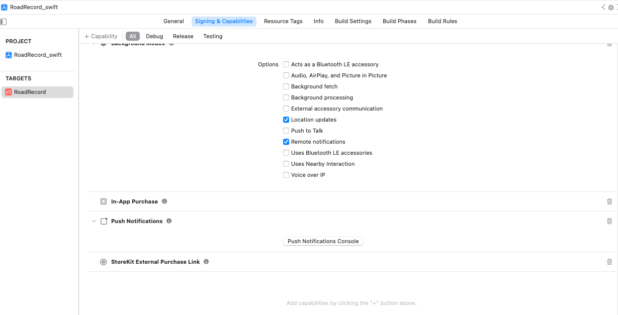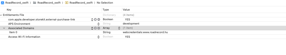 We’ve enabled both StoreKit External Purchase and StoreKit External Purchase Link entitlements for our app (“RoadRecord útnyilvántartó”) and confirmed they are active in Xcode and App ID configuration.