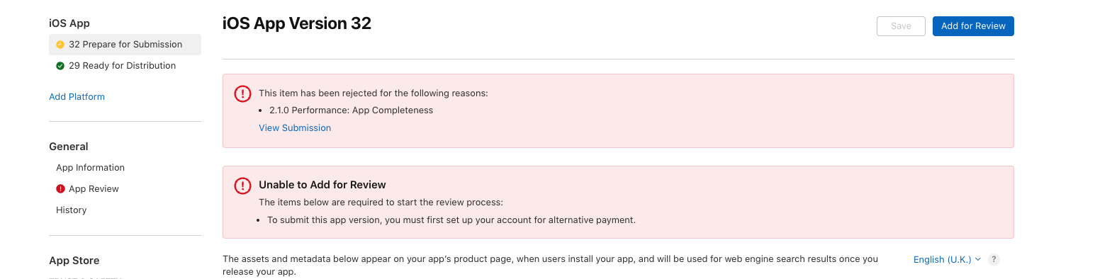 “To submit this app version, you must first set up your account for alternative payment.”