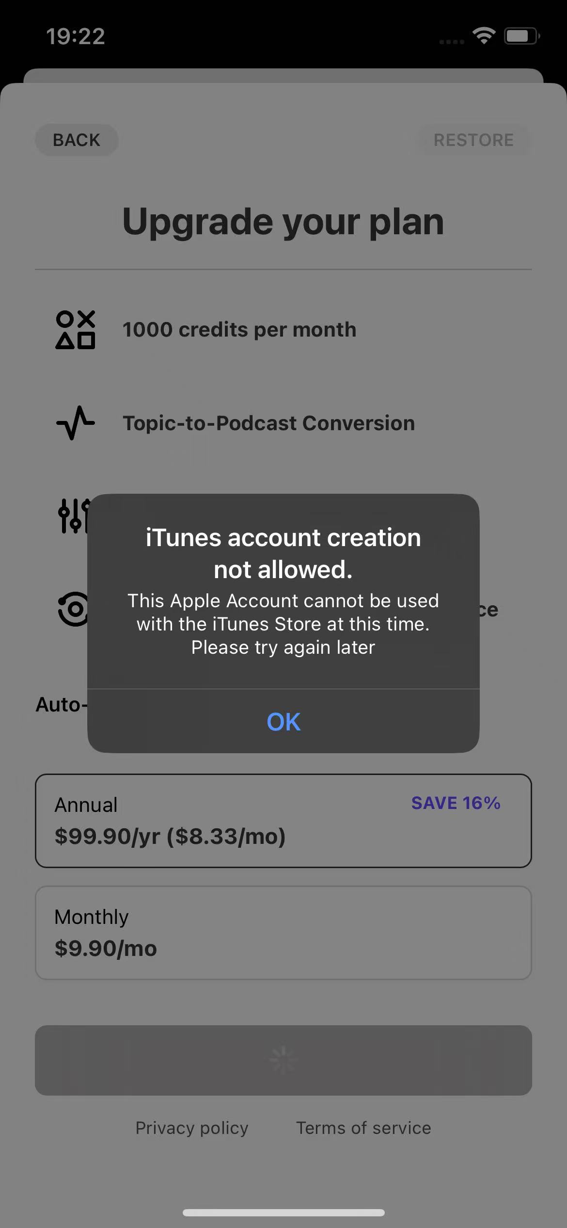 I am a test engineer. When I subscribe with a sandbox account in a test project, I find that the prompt "Not allowed to create an iTunes account" appears, but my account was successfully added in the sandbox. I tried two different email suffixes @gmail.com and @tester.com, and both showed this prompt. The developers in the team were also unable to solve this problem. Does anyone know how to deal with this situation?
