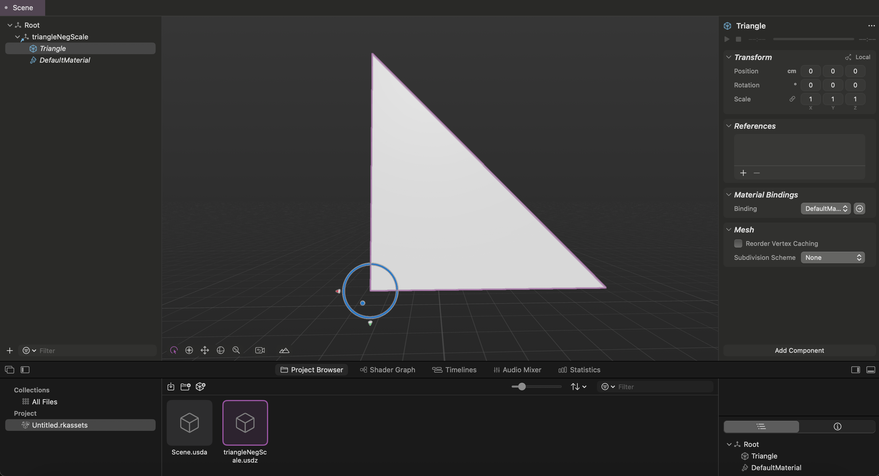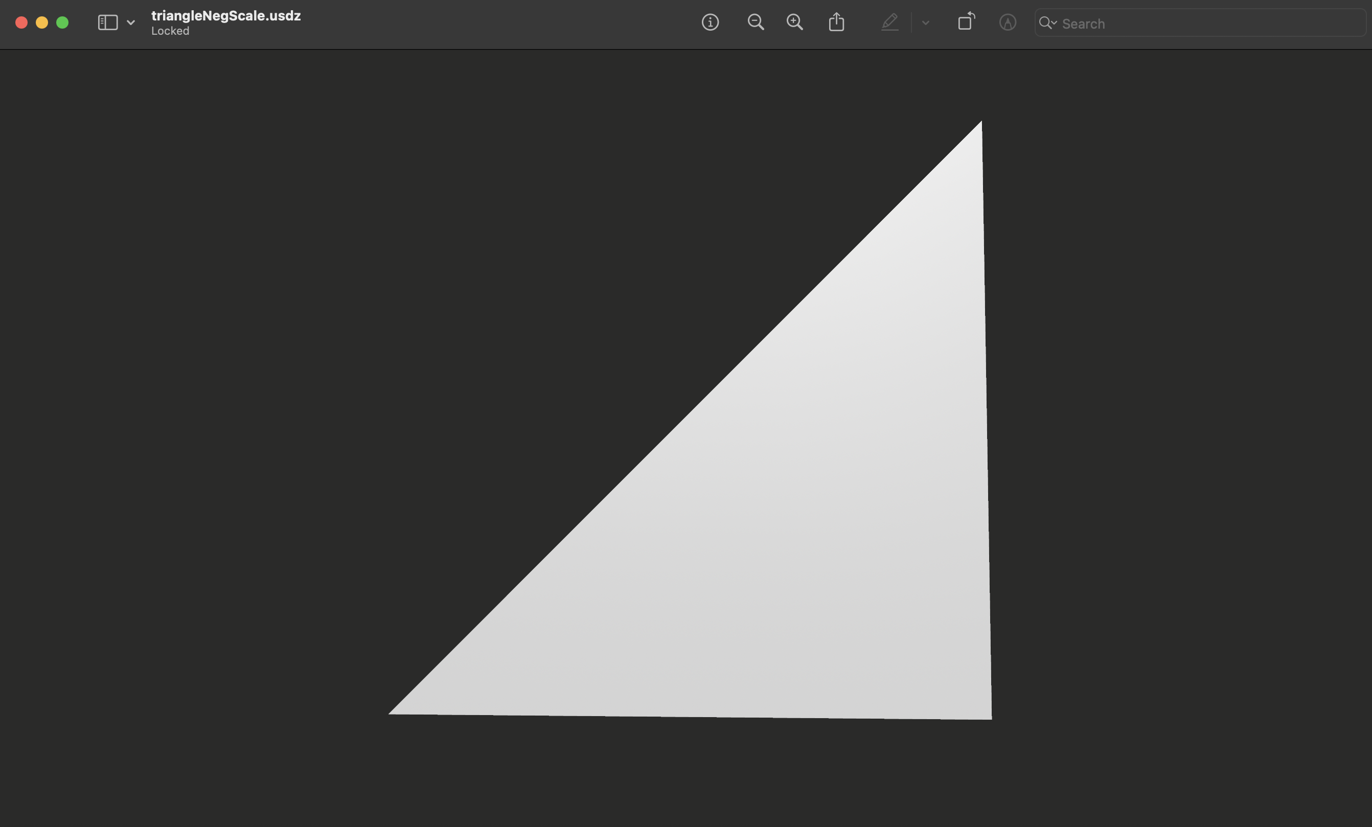 I created a simple test asset, a single triangle, to demonstrate this. The triangle's vertices are defined in a counter-clockwise ("right-handed") winding order, and its transform has a negative scale on the X-axis. According to the OpenUSD specification, this negative determinant in the transformation matrix should effectively reverse the winding order of the geometry: