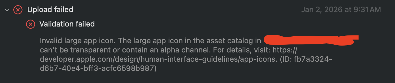 "Invalid large app icon. The app icon in the asset catalog -app name- can't be transparent or contain an alpha channel."