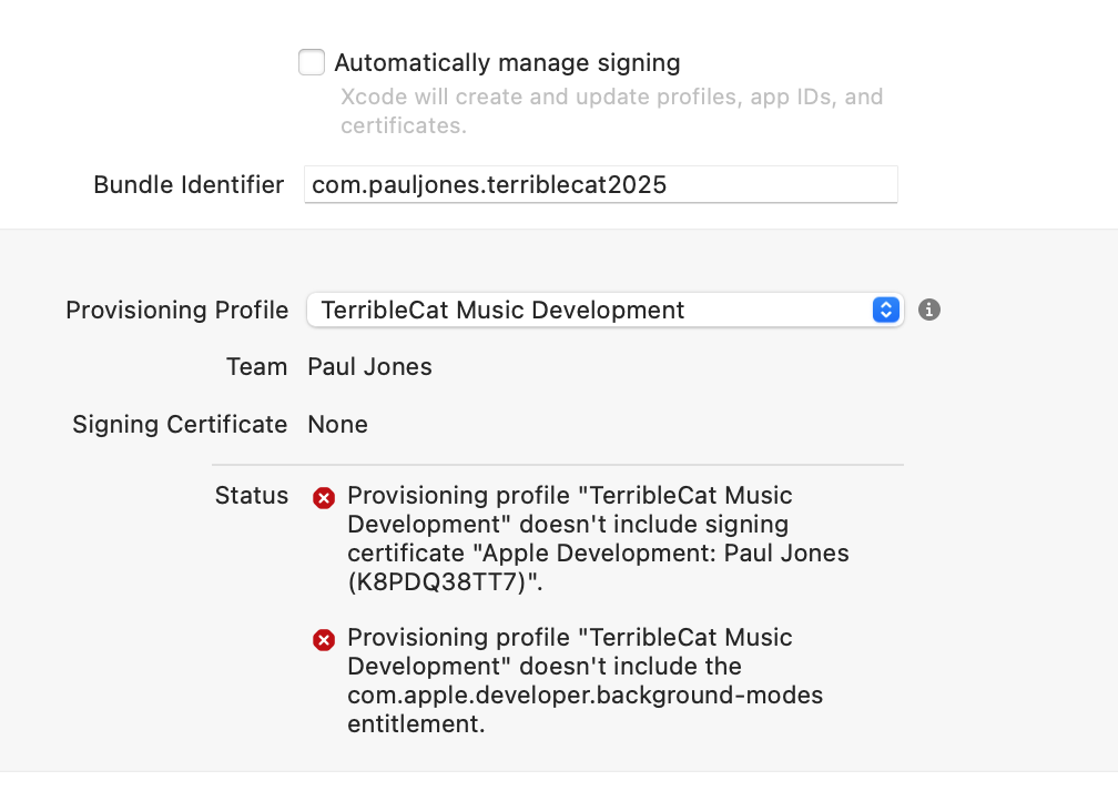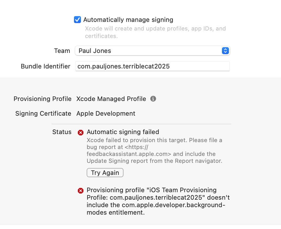I'm working in Xcode Version 16.4. I have not been able to sign in without errors. I've paid for the dev account. I've created certificates. Downloaded and uploaded CSRs. Use background mode, not used background mode. Nothing seems to work. Thank you for looking into this! Hopefully you can point me in the right direction or find a solution. Attached screenshots with errors.