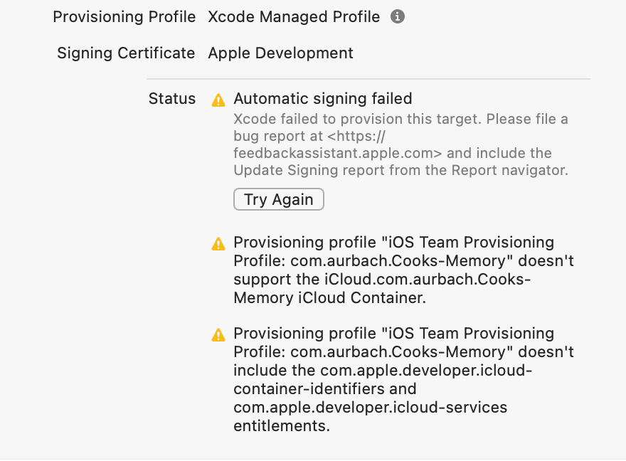 When I did this, automatic code signing failed. (see attached for the messages). I tried creating and downloading a new provisioning profile, but that did not help.