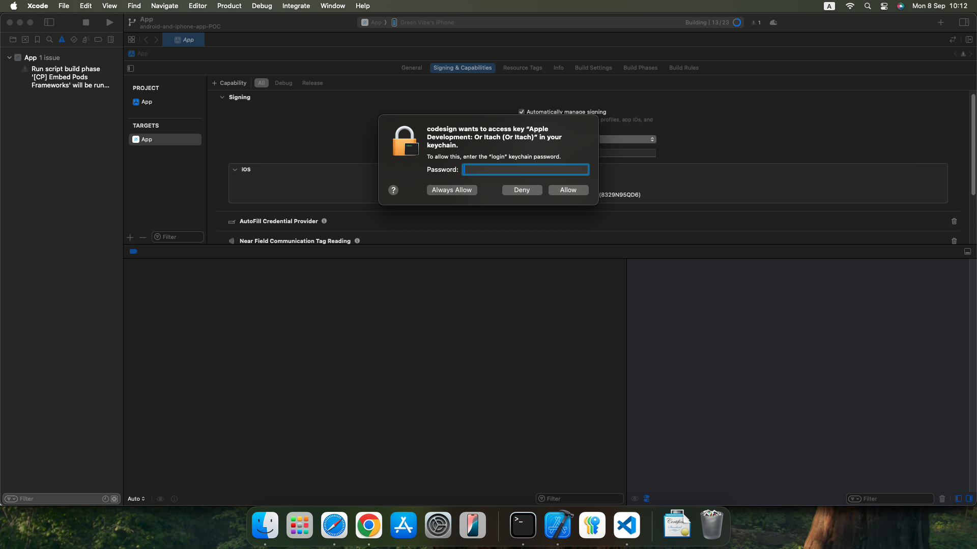 The Issue: When attempting to add NFC, I was able to create the required certificate under the name Or Itach. However, when compiling the project, Xcode prompts me to enter the login password for the user Or Itach. This is problematic because there is no Apple ID associated with that name — only the Apple Developer enrollment under Green Vibe exists.