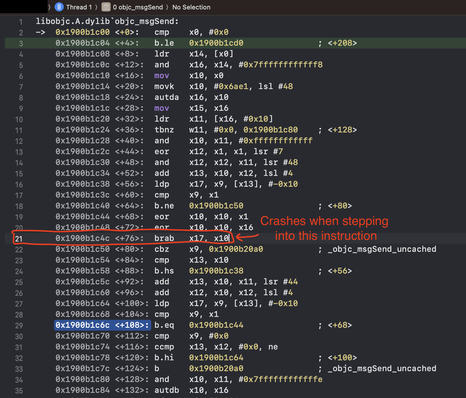 Throughout all of the above, the crashes would come and go, very reproducibly for a given branch being merged in, but if a subsequent branch is merged in, the crash may go away, or simply move somewhere else - sometimes it would crash in our code that calls other parts of our code, and other times when calling system frameworks (like the UIColor example above). One thing that is consistent though, is that the crash would never happen anywhere near the code that was changed or added by a branch that was merged in.