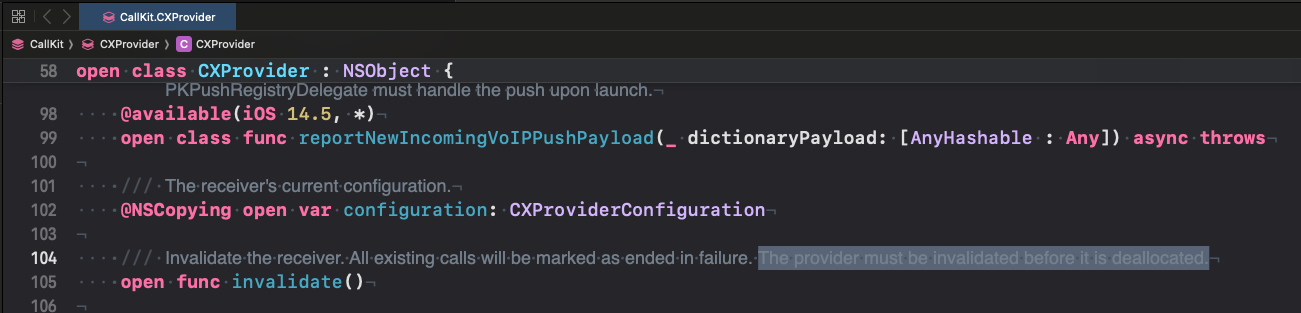 held as a global singleton, so it’s unlikely to be deinited. - There is no explicit call to CXProvider.invalidate() in the app.