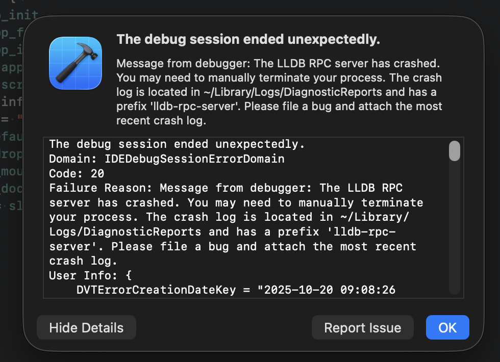 Hi I am seeing an LLDB crash in the RPC server. I have tried to update and restart everything but I am still seeing this problem. I have break points setup around code that is invoked when a WKWebView based code is being loaded. There does not seem to be a specific state the debugger crashes in and it is hard to isolate any changes in the code base. A collegue also managed to reproduce the crash. Ever so often it will be successful on then to crash on a subsequent run. This has happened on Device and simulator. We suspect that maybe a library change may of caused debug symbols to be missing or something like that. What options to I have to debug the root cause of this crash?