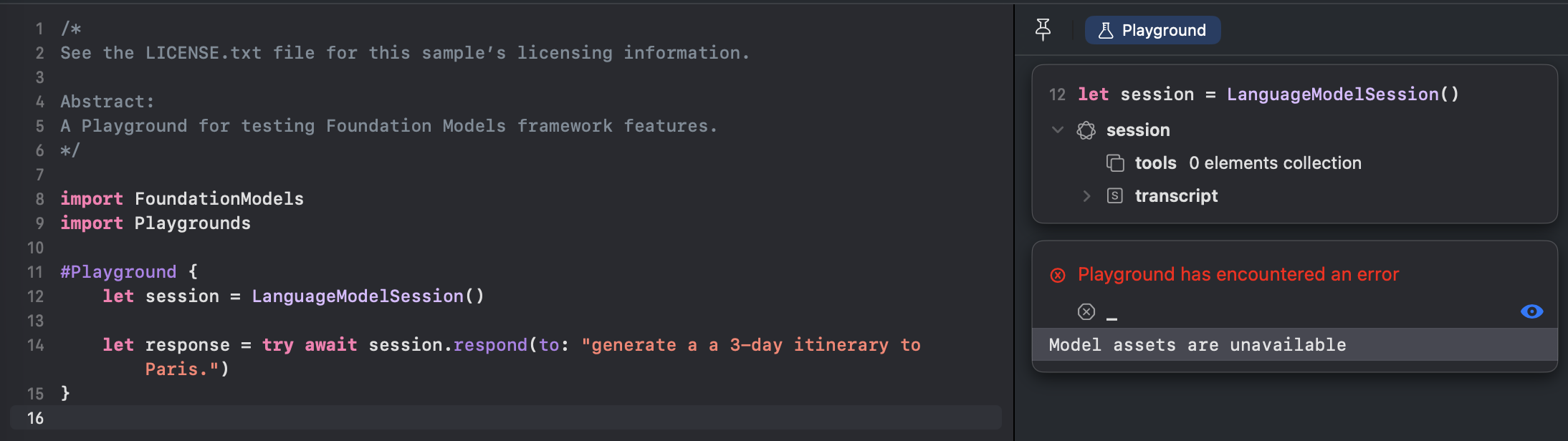 For the Foundation Models framework on-device model asset to be on your device, you need Apple Intelligence enabled on your device. Check this in the Settings app.