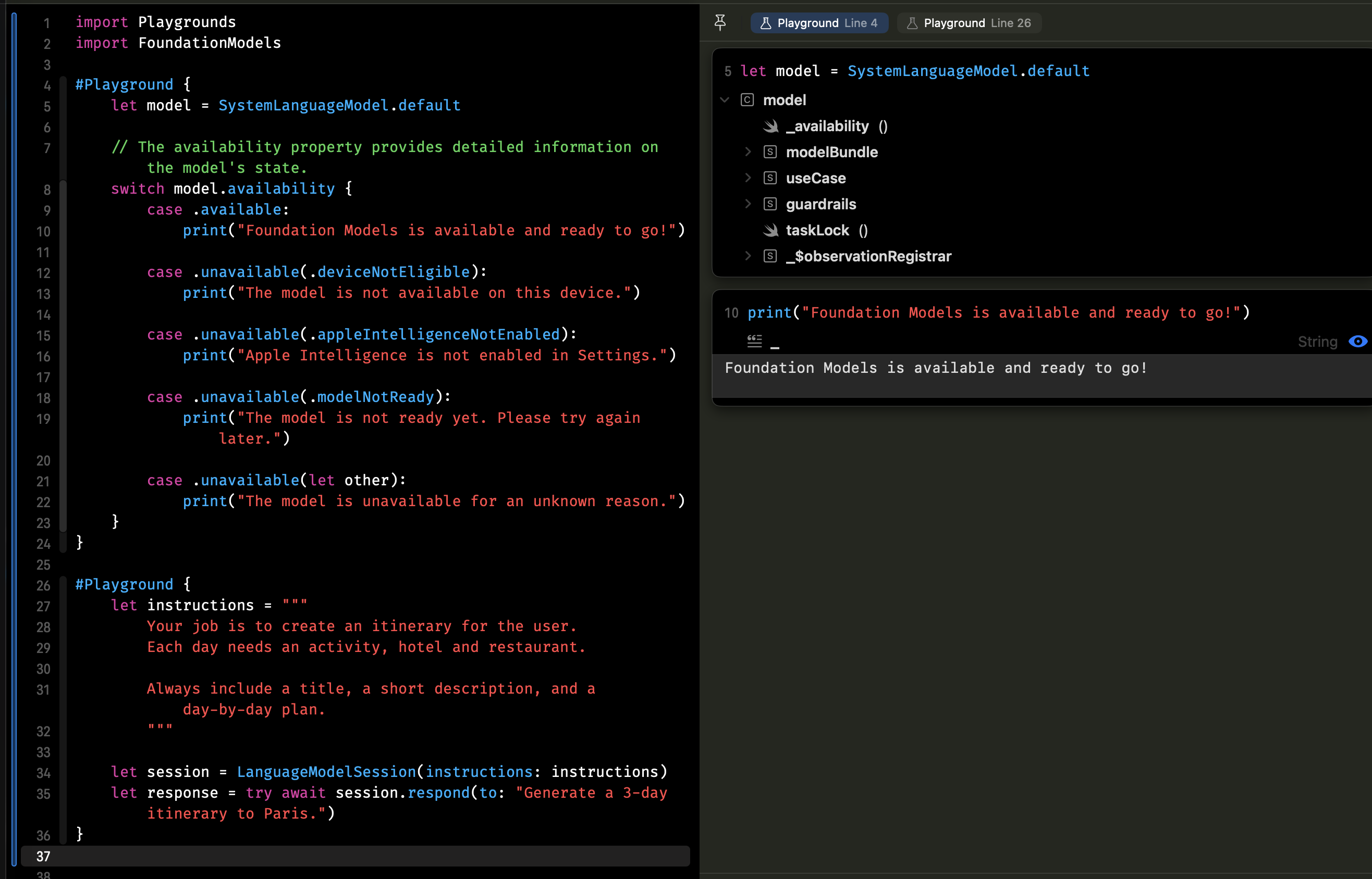 For a more detailed model availability status in Foundation Models Framework, you can print out SystemLanguageModel.Availability