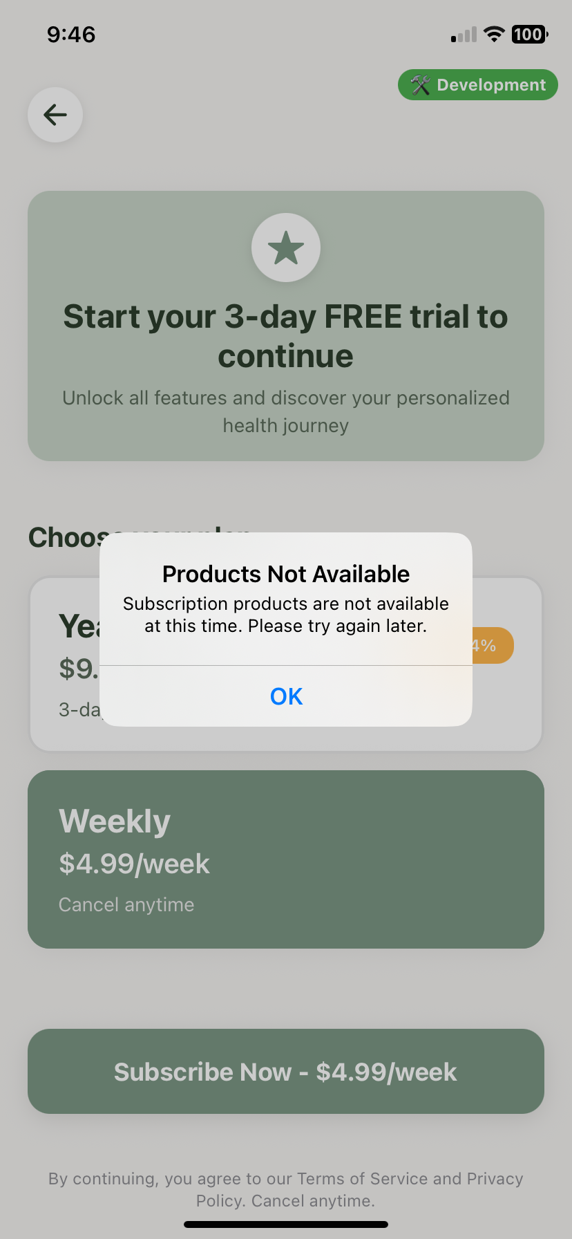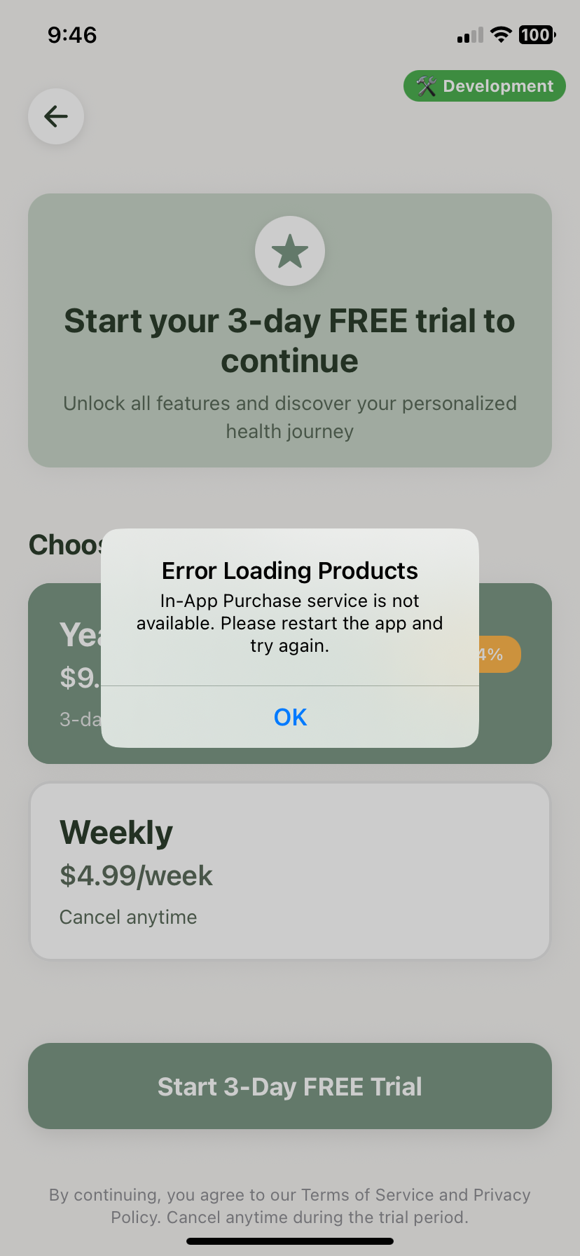 I coded my mobile app using Cursor and have recently been building and submitting for TestFlight using XCode version 16.1. I am testing using my Iphone via the downloaded build from TestFlight. My onboarding flow goes smoothly, but when I reach the checkout page I receive an error that says "Error Loading Products". When I select "OK" and then try to click one of my available products I receive another error that says "Products Not Available". I am signed out of my main Apple ID and signed into a Sandbox user that is valid. I have all of my application agreements signed and valid. I believe everything is configured properly, but I have been receiving purchase errors for the past week with no progress.