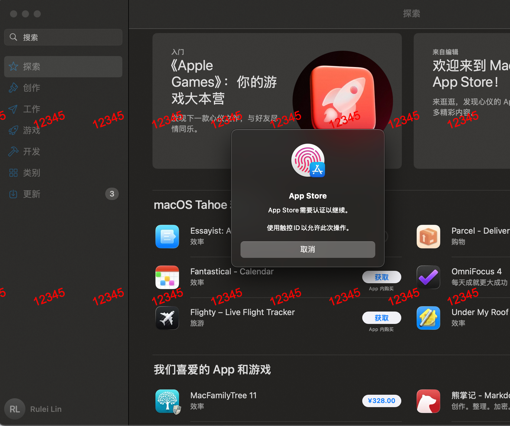 2.After the watermark app running a watermark window is showing at the left top corner. 3. Open App Store and try to install any app, after the confirm installation dialog appears, move the App Store window to desktop watermark area, the confirm installation button will disappear.